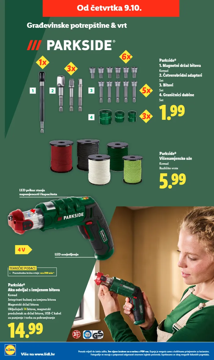 Građevinske potrepštine & vrt Od četvrtka 9.10. 5.99 Parkside® Višenamjensko uže Komad Različite vrste 1.99 Parkside® 1. Magnetni držač bitova Komad 2. Četverobridni adapteri Set 3. Bitovi Set 4. Graničnici dubine Set 14.99 Parkside® Aku odvijač s izmjenom bitova Komad Integrirani bubanj za izmjenu bitova Magnetski držač bitova Uključujući 14 bitova, magnetski produžetak za držač bitova, USB-C kabel za punjenje i torba za pohranjivanje Ponuda vrijedi do isteka zaliha. Sve cijene izražene su u eurima s PDV-om. Kupnja je moguća samo u količinama primjerenim za kućanstvo. Fotografije ne moraju u potpunosti odgovarati stvarnom izgledu proizvoda. Ispričavamo se zbog mogućih tiskarskih pogrešaka. Više na www.lidl.hr 4 V LED prikaz stanja napunjenosti i kapaciteta LED osvjetljenje TEHNIČKI PODACI • Praznohodna brzina vrtnje: cca 200 min - ¹ 1 2 3 4 3x 3x 6x 5x 1x