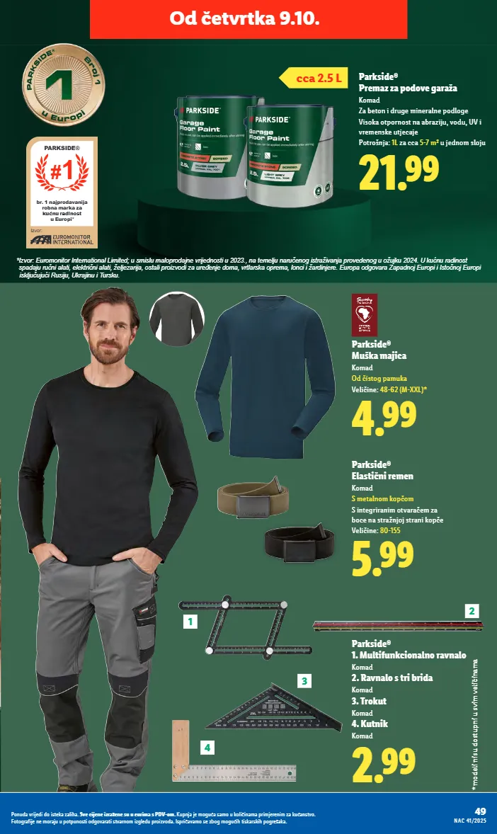 od četvrtka 9.10. 4.99 parkside® muška majica komad od čistog pamuka veličine: 48-62 (m-xxl)* 5.99 parkside® elastični remen komad s metalnom kopčom s integriranim otvaračem za boce na stražnjoj strani kopče veličine: 80-155 21.99 parkside® premaz za podove garaža komad za beton i druge mineralne podloge visoka otpornost na abraziju, vodu, uv i vremenske utjecaje potrošnja: 1l za cca 5-7 m² u jednom sloju 49 nac 41/2025 ponuda vrijedi do isteka zaliha. sve cijene izražene su u eurima s pdv-om. kupnja je moguća samo u količinama primjerenim za kućanstvo. fotografije ne moraju u potpunosti odgovarati stvarnom izgledu proizvoda. ispričavamo se zbog mogućih tiskarskih pogrešaka. cca 2.5 l 2.99 parkside® 1. multifunkcionalno ravnalo komad 2. ravnalo s tri brida komad 3. trokut komad 4. kutnik komad 1 2 3 4 *modeli nisu dostupni u svim veličinama *izvor: euromonitor international limited; u smislu maloprodajne vrijednosti u 2023., na temelju naručenog istraživanja provedenog u ožujku 2024. u kućnu radinost spadaju ručni alati, električni alati, željezarija, ostali proizvodi za uređenje doma, vrtlarska oprema, lonci i žardinjere. europa odgovara zapadnoj europi i istočnoj europi isključujući rusiju, ukrajinu i tursku. izvor: # 1 br. 1 najprodavanija robna marka za kućnu radinost u europi* parkside®