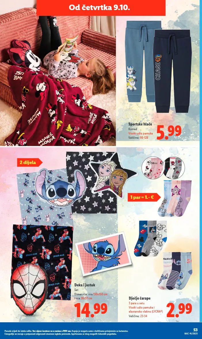 2.99 dječje čarape 3 para u setu visoki udio pamuka i elastansko vlakno (lycra®) veličine: 23-34 14.99 deka i jastuk set dimenzije: cca 130x150 cm i cca 26x37 cm od četvrtka 9.10. sportske hlače komad visoki udio pamuka veličine: 98-128 5.99 53 nac 41/2025 ponuda vrijedi do isteka zaliha. sve cijene izražene su u eurima s pdv-om. kupnja je moguća samo u količinama primjerenim za kućanstvo. fotografije ne moraju u potpunosti odgovarati stvarnom izgledu proizvoda. ispričavamo se zbog mogućih tiskarskih pogrešaka. 2 dijela 1 par = 1.- €