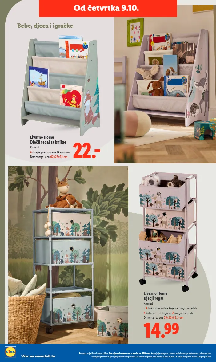 14.99 Livarno Home Dječji regal Komad S 4 tekstilne kutije koje se mogu izvaditi 4 kotača – od toga se 2 mogu fiksirati Dimenzije: cca 35x26x82,5 cm 22.- Livarno Home Dječji regal za knjige Komad 4 džepa presvučena tkaninom Dimenzije: cca 62x28x72 cm Bebe, djeca i igračke Od četvrtka 9.10. Ponuda vrijedi do isteka zaliha. Sve cijene izražene su u eurima s PDV-om. Kupnja je moguća samo u količinama primjerenim za kućanstvo. Fotografije ne moraju u potpunosti odgovarati stvarnom izgledu proizvoda. Ispričavamo se zbog mogućih tiskarskih pogrešaka. Više na www.lidl.hr
