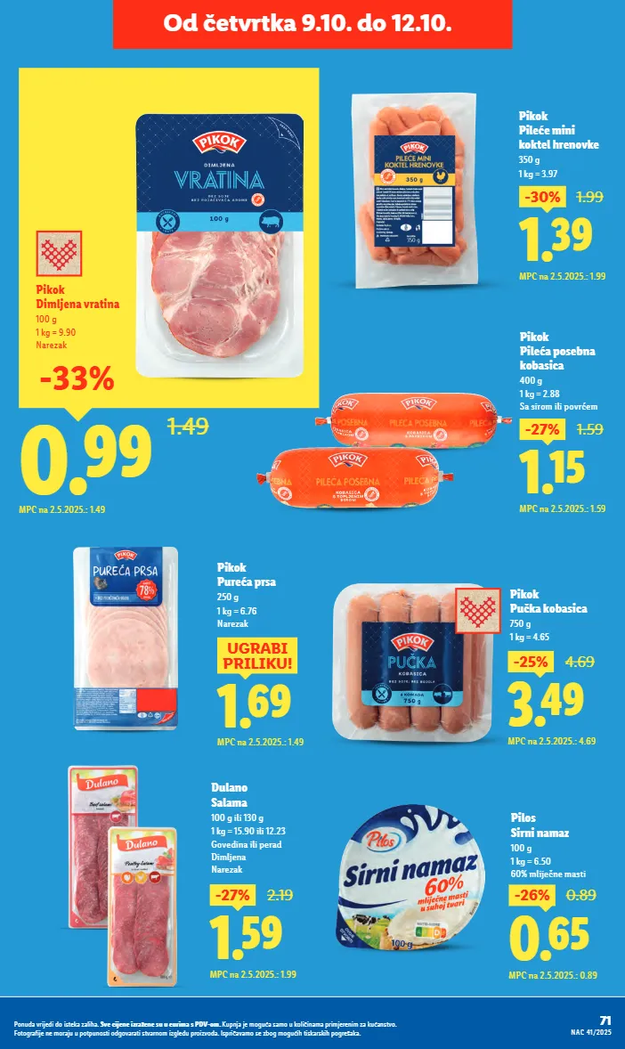 0.99 1.49 pikok dimljena vratina 100 g 1 kg = 9.90 narezak mpc na 2.5.2025.: 1.49 -33% 1.59 -27% 2.19 mpc na 2.5.2025.: 1.99 pikok pureća prsa 250 g 1 kg = 6.76 narezak 1.69 ugrabi priliku! mpc na 2.5.2025.: 1.49 1.15 -27% 1.59 mpc na 2.5.2025.: 1.59 pikok pileća posebna kobasica 400 g 1 kg = 2.88 sa sirom ili povrćem 0.65 -26% 0.89 mpc na 2.5.2025.: 0.89 pilos sirni namaz 100 g 1 kg = 6.50 60% mliječne masti 1.39 -30% 1.99 mpc na 2.5.2025.: 1.99 pikok pileće mini koktel hrenovke 350 g 1 kg = 3.97 dulano salama 100 g ili 130 g 1 kg = 15.90 ili 12.23 govedina ili perad dimljena narezak 3.49 -25% 4.69 mpc na 2.5.2025.: 4.69 pikok pučka kobasica 750 g 1 kg = 4.65 71 ponuda vrijedi do isteka zaliha. sve cijene izražene su u eurima s pdv-om. kupnja je moguća samo u količinama primjerenim za kućanstvo. fotografije ne moraju u potpunosti odgovarati stvarnom izgledu proizvoda. ispričavamo se zbog mogućih tiskarskih pogrešaka. nac 41/2025 od četvrtka 9.10. do 12.10.