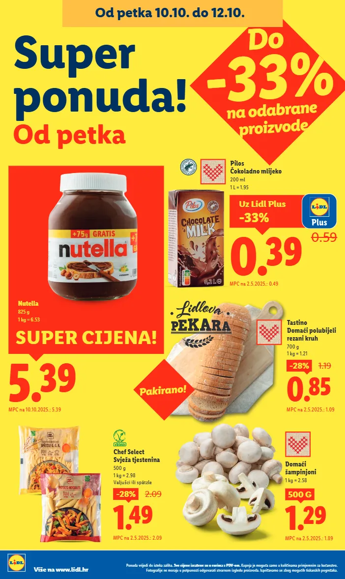 do -33% na odabrane proizvode pilos čokoladno mlijeko 200 ml 1 l = 1.95 super ponuda! od petka 1.49 -28% 2.09 mpc na 2.5.2025.: 2.09 0.85 -28% 1.19 mpc na 2.5.2025.: 1.09 chef select svježa tjestenina 500 g 1 kg = 2.98 valjušci ili spätzle 5.39 mpc na 10.10.2025.: 5.39 super cijena! nutella 825 g 1 kg = 6.53 tastino domaći polubijeli rezani kruh 700 g 1 kg = 1.21 uz lidl plus -33% 0.39 0.59 mpc na 2.5.2025.: 0.49 pakirano! domaći šampinjoni 1 kg = 2.58 1.29 500 g mpc na 2.5.2025.: 1.89 ponuda vrijedi do isteka zaliha. sve cijene izražene su u eurima s pdv-om. kupnja je moguća samo u količinama primjerenim za kućanstvo. fotografije ne moraju u potpunosti odgovarati stvarnom izgledu proizvoda. ispričavamo se zbog mogućih tiskarskih pogrešaka. više na www.lidl.hr od petka 10.10. do 12.10.