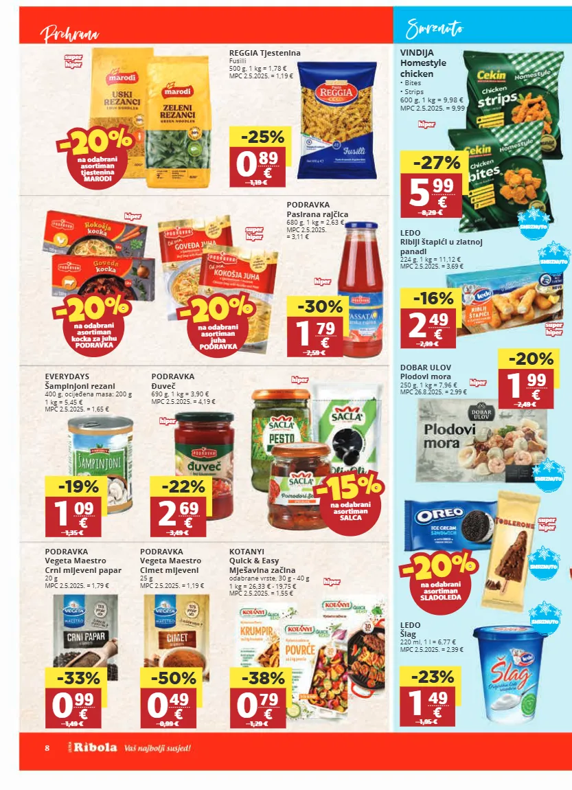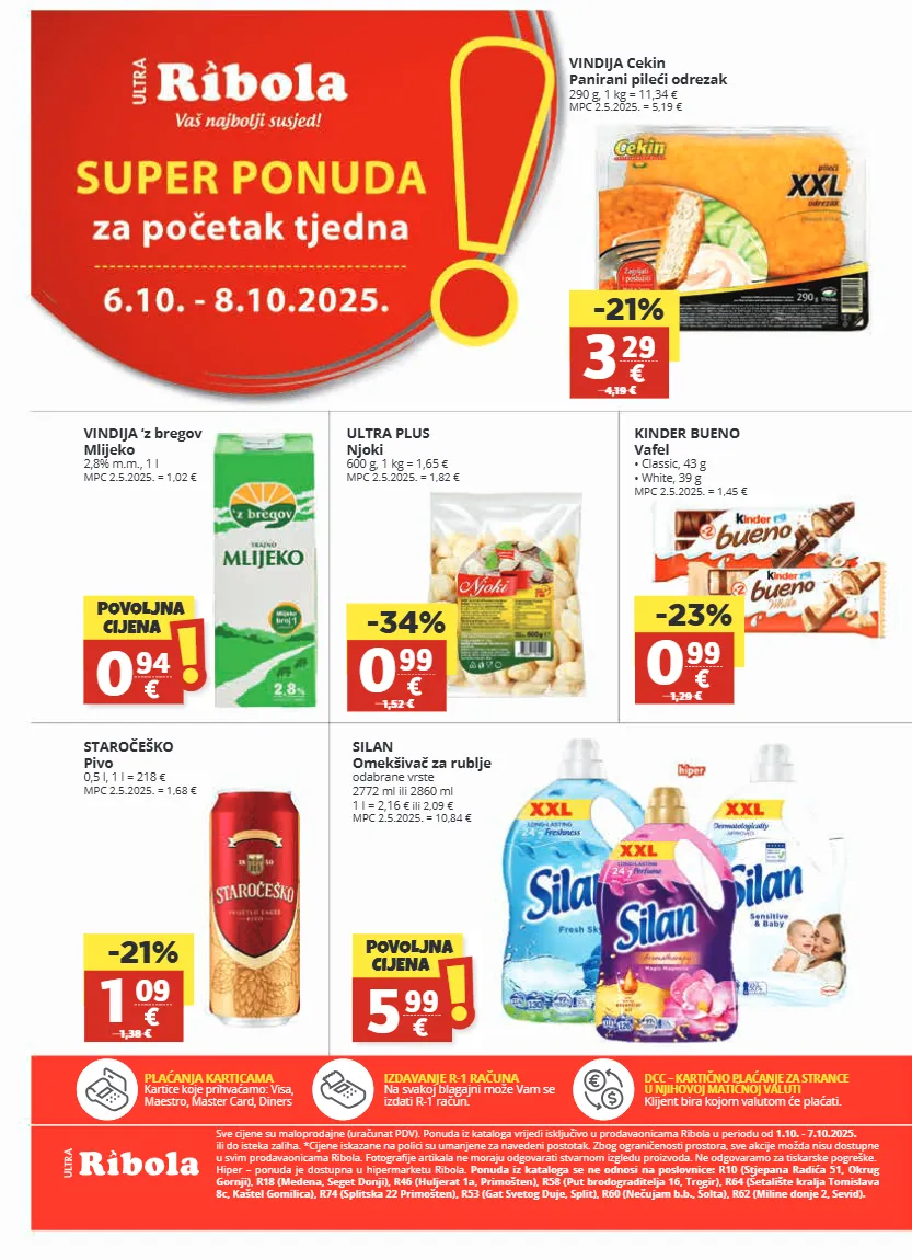 plaćanja karticama kartice koje prihvaćamo: visa, maestro, master card, diners izdavanje r-1 računa na svakoj blagajni može vam se izdati r-1 račun. dcc – kartično plaćanje za strance u njihovoj matičnoj valuti klijent bira kojom valutom će plaćati. sve cijene su maloprodajne (uračunat pdv). ponuda iz kataloga vrijedi isključivo u prodavaonicama ribola u periodu od 1.10. - 7.10.2025. ili do isteka zaliha. *cijene iskazane na polici su umanjene za navedeni postotak. zbog ograničenosti prostora, sve akcije možda nisu dostupne u svim prodavaonicama ribola. fotografije artikala ne moraju odgovarati stvarnom izgledu proizvoda. ne odgovaramo za tiskarske pogreške. hiper – ponuda je dostupna u hipermarketu ribola. ponuda iz kataloga se ne odnosi na poslovnice: r10 (stjepana radića 51, okrug gornji), r18 (medena, seget donji), r46 (huljerat 1a, primošten), r58 (put brodograditelja 16, trogir), r64 (šetalište kralja tomislava 8c, kaštel gomilica), r74 (splitska 22 primošten), r53 (gat svetog duje, split), r60 (nečujam b.b., šolta), r62 (miline donje 2, sevid). -21% 3 29 4,19 € -34% 0 99 1,52 € -21% 1 09 1,38 € -23% 0 99 1,29 € vindija cekin panirani pileći odrezak 290 g, 1 kg = 11,34 € mpc 2.5.2025. = 5,19 € vindija ‘z bregov mlijeko 2,8% m.m., 1 l mpc 2.5.2025. = 1,02 € ultra plus njoki 600 g, 1 kg = 1,65 € mpc 2.5.2025. = 1,82 € kinder bueno vafel • classic, 43 g • white, 39 g mpc 2.5.2025. = 1,45 € silan omekšivač za rublje odabrane vrste 2772 ml ili 2860 ml 1 l = 2,16 € ili 2,09 € mpc 2.5.2025. = 10,84 € staročeško pivo 0,5 l, 1 l = 218 € mpc 2.5.2025. = 1,68 € 0 94 ! ! povoljna cijena 5 99 ! ! povoljna cijena