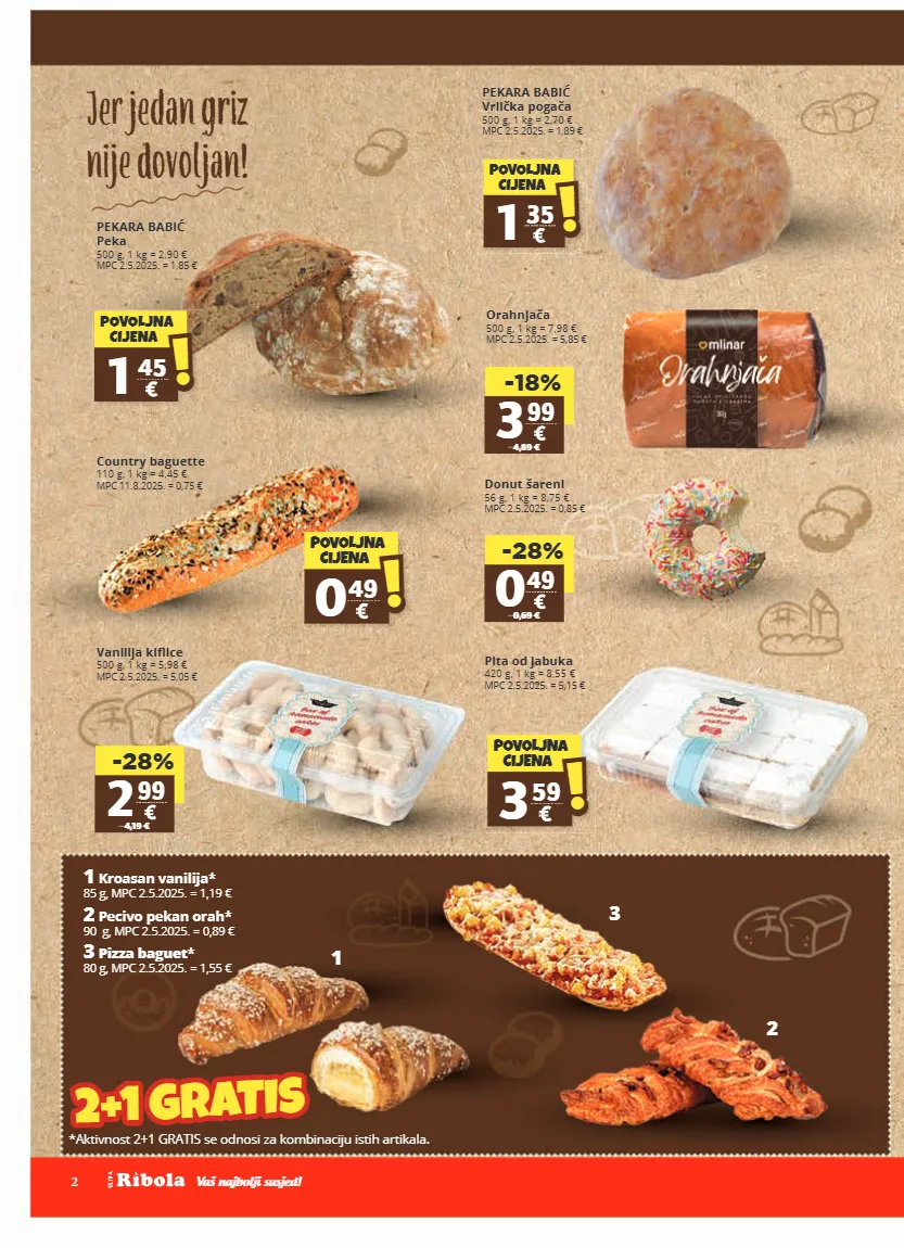 2 vaš najbolji susjed! -28% 0 49 0,69 € -18% 3 99 4,89 € -28% 2 99 4,19 € 1 45 povoljna cijena ! ! 1 35 povoljna cijena ! ! 0 49 povoljna cijena ! ! 3 59 povoljna cijena ! ! jr jdn gi nj oojn! 1 kroasan vanilija* 85 g, mpc 2.5.2025. = 1,19 € 2 pecivo pekan orah* 90 g, mpc 2.5.2025. = 0,89 € 3 pizza baguet * 80 g, mpc 2.5.2025. = 1,55 € *aktivnost 2+1 gratis se odnosi za kombinaciju istih artikala. 2+1 gratis 2+1 gratis 1 3 2 pekara babić peka 500 g, 1 kg = 2,90 € mpc 2.5.2025. = 1,85 € country baguette 110 g, 1 kg = 4,45 € mpc 11.8.2025. = 0,75 € orahnjača 500 g, 1 kg = 7,98 € mpc 2.5.2025. = 5,85 € vanilija kiflice 500 g, 1 kg = 5,98 € mpc 2.5.2025. = 5,05 € pita od jabuka 420 g, 1 kg = 8,55 € mpc 2.5.2025. = 5,15 € pekara babić vrlička pogača 500 g, 1 kg = 2,70 € mpc 2.5.2025. = 1,89 € donut šareni 56 g, 1 kg = 8,75 € mpc 2.5.2025. = 0,85 €
