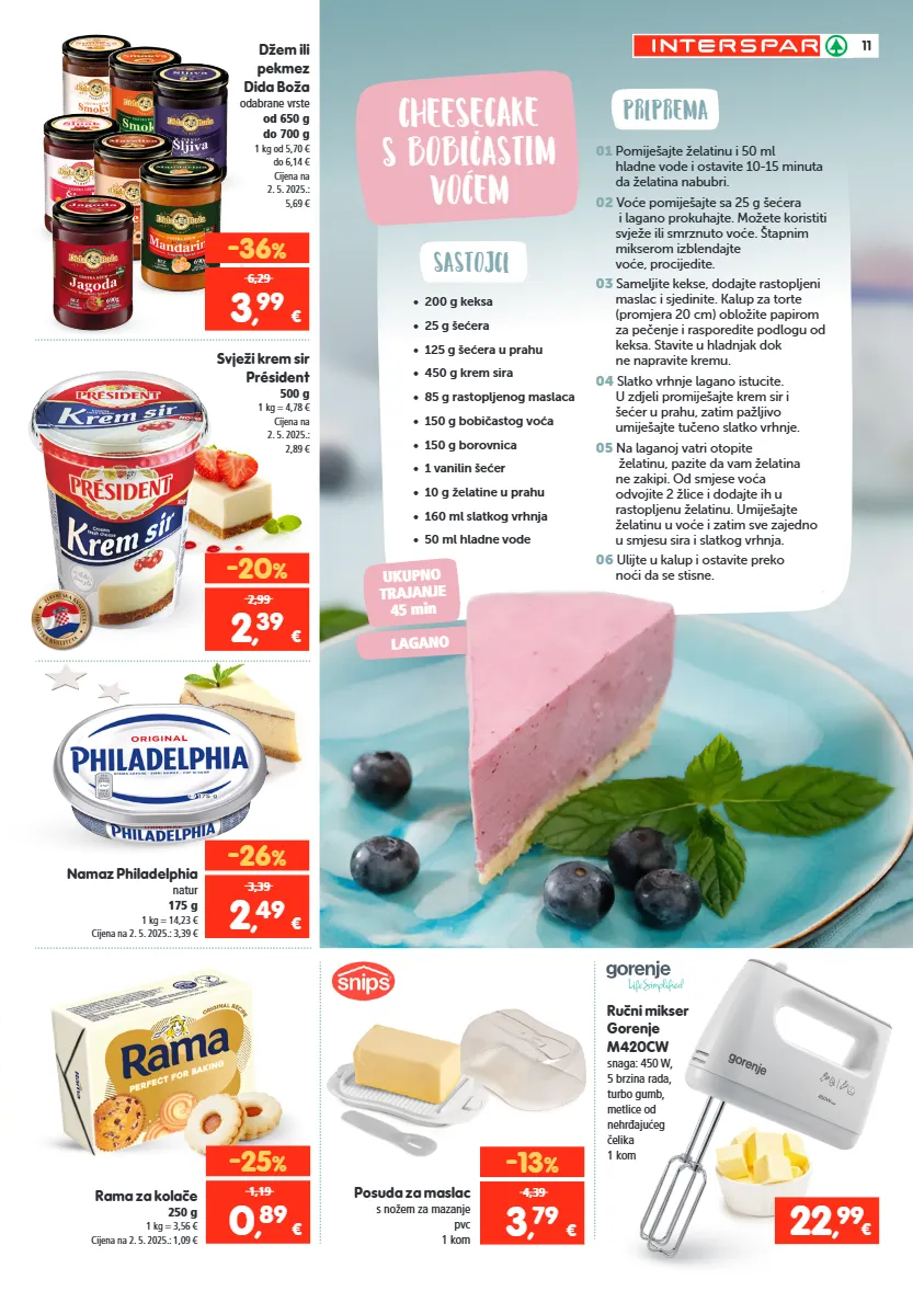 rama za kolače 250 g 1 kg = 3,56 € cijena na 2. 5. 2025.: 1,09 € posuda za maslac s nožem za mazanje pvc 1 kom 1,19 0 , 89 € -25 % 4,39 3 , 79 € -13 % svježi krem sir président 500 g 1 kg = 4,78 € cijena na 2. 5. 2025.: 2,89 € džem ili pekmez dida boža odabrane vrste od 650 g do 700 g 1 kg od 5,70 € do 6,14 € cijena na 2. 5. 2025.: 5,69 € 2,99 2 , 39 € -20 % 6,29 3 , 99 € -36 % namaz philadelphia natur 175 g 1 kg = 14,23 € cijena na 2. 5. 2025.: 3,39 € 3,39 2 , 49 € -26 % ručni mikser gorenje m420cw snaga: 450 w, 5 brzina rada, turbo gumb, metlice od nehrđajućeg čelika 1 kom 22 , 99 € • 200 g keksa • 25 g šećera • 125 g šećera u prahu • 450 g krem sira • 85 g rastopljenog maslaca • 150 g bobičastog voća • 150 g borovnica • 1 vanilin šećer • 10 g želatine u prahu • 160 ml slatkog vrhnja • 50 ml hladne vode 01 pomiješajte želatinu i 50 ml hladne vode i ostavite 10-15 minuta da želatina nabubri. 02 voće pomiješajte sa 25 g šećera i lagano prokuhajte. možete koristiti svježe ili smrznuto voće. štapnim mikserom izblendajte voće, procijedite. 03 sameljite kekse, dodajte rastopljeni maslac i sjedinite. kalup za torte (promjera 20 cm) obložite papirom za pečenje i rasporedite podlogu od keksa. stavite u hladnjak dok ne napravite kremu. 04 slatko vrhnje lagano istucite. u zdjeli promiješajte krem sir i šećer u prahu, zatim pažljivo umiješajte tučeno slatko vrhnje. 05 na laganoj vatri otopite želatinu, pazite da vam želatina ne zakipi. od smjese voća odvojite 2 žlice i dodajte ih u rastopljenu želatinu. umiješajte želatinu u voće i zatim sve zajedno u smjesu sira i slatkog vrhnja. 06 ulijte u kalup i ostavite preko noći da se stisne. cheesecake s bobičastim voćem priprema sastojci ukupno trajanje 45 min lagano 11