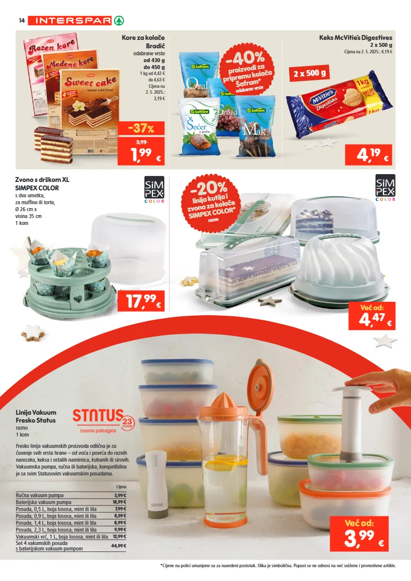 Već od: 3 , 99 € -40 % proizvodi za pripremu kolača Šafram* odabarne vrste Keks McVitie´s Digestives 2 x 500 g Cijena na 2. 5. 2025.: 4,19 € 3,19 1 , 99 € -37 % Zvono s drškom XL SIMPEX COLOR s dva umetka, za muffine ili torte, Ø 26 cm x visina 35 cm 1 kom 2 x 500 g 4 , 19 € 17 , 99 € Kore za kolače Bradić odabrane vrste od 430 g do 450 g 1 kg od 4,42 € do 4,63 € Cijena na 2. 5. 2025.: 3,19 € Cijena Ručna vakuum pumpa 3,99 € Baterijska vakuum pumpa 18,99 € Posuda, 0,5 L, boja lososa, mint ili lila 7,99 € Posuda, 0,9 L, boja lososa, mint ili lila 8,59 € Posuda, 1,4 L, boja lososa, mint ili lila 8,99 € Posuda, 2,3 L, boja lososa, mint ili lila 9,99 € Vakuumski vrč, 1 L, boja lososa, mint ili lila 12,99 € Set 4 vakumskih posuda s baterijskom vakuum pumpom 44,99 € Linija Vakuum Fresko Status razno 1 kom Fresko linija vakuumskih proizvoda odlična je za čuvanje svih vrsta hrane – od voća i povrća do raznih narezaka, keksa i ostalih namirnica, kuhanih ili sirovih. Vakuumska pumpa, ručna ili baterijska, kompatibilna je sa svim Statusovim vakuumskim posudama. Već od: 4 , 47 € -20 % linija kutija i zvona za kolače SIMPEX COLOR* razno 14 *Cijene na polici umanjene su za navedeni postotak. Slika je simbolična. Popust se ne odnosi na već snižene i promotivne artikle.