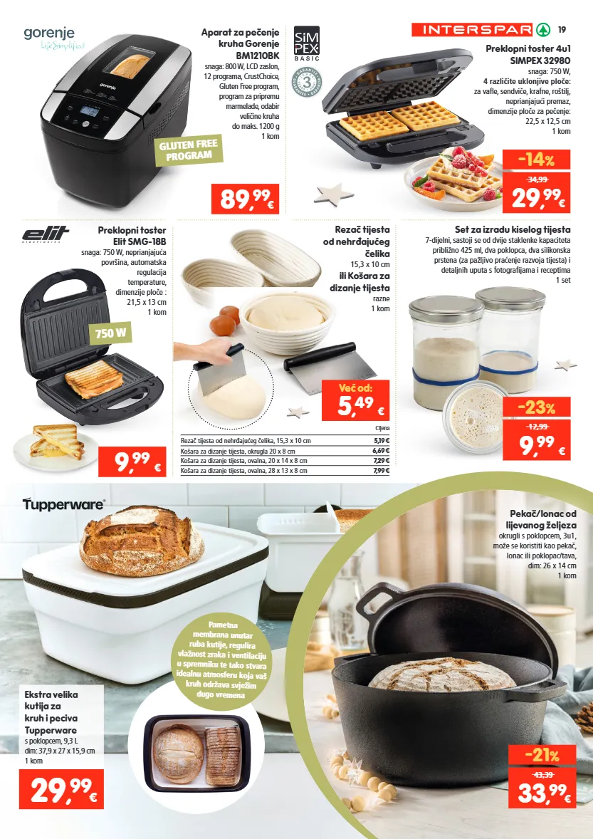 34,99 29 , 99 € -14 % set za izradu kiselog tijesta 7-dijelni, sastoji se od dvije staklenke kapaciteta približno 425 ml, dva poklopca, dva silikonska prstena (za pažljivo praćenje razvoja tijesta) i detaljnih uputa s fotografijama i receptima 1 set preklopni toster elit smg-18b snaga: 750 w, neprianjajuća površina, automatska regulacija temperature, dimenzije ploče : 21,5 x 13 cm 1 kom preklopni toster 4u1 simpex 32980 snaga: 750 w, 4 različite uklonjive ploče: za vafle, sendviče, krafne, roštilj, neprianjajući premaz, dimenzije ploče za pečenje: 22,5 x 12,5 cm 1 kom rezač tijesta od nehrđajućeg čelika 15,3 x 10 cm ili košara za dizanje tijesta razne 1 kom već od: 5 , 49 € pekač/lonac od lijevanog željeza okrugli s poklopcem, 3u1, može se koristiti kao pekač, lonac ili poklopac/tava, dim: 26 x 14 cm 1 kom 9 , 99 € cijena rezač tijesta od nehrđajućeg čelika, 15,3 x 10 cm 5,19 € košara za dizanje tijesta, okrugla 20 x 8 cm 6,69 € košara za dizanje tijesta, ovalna, 20 x 14 x 8 cm 7,29 € košara za dizanje tijesta, ovalna, 28 x 13 x 8 cm 7,99 € 89 , 99 € aparat za pečenje kruha gorenje bm1210bk snaga: 800 w, lcd zaslon, 12 programa, crustchoice, gluten free program, program za pripremu marmelade, odabir veličine kruha do maks. 1200 g 1 kom gluten free program 12,99 9 , 99 € -23 % 43,39 33 , 99 € -21 % 29 , 99 € ekstra velika kutija za kruh i peciva tupperware s poklopcem, 9,3 l dim: 37,9 x 27 x 15,9 cm 1 kom 750 w pametna membrana unutar ruba kutije, regulira vlažnost zraka i ventilaciju u spremniku te tako stvara idealnu atmosferu koja vaš kruh održava svježim dugo vremena 19