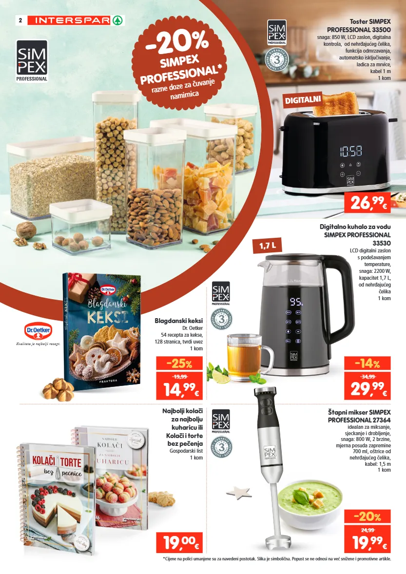 *cijene na polici umanjene su za navedeni postotak. slika je simbolična. popust se ne odnosi na već snižene i promotivne artikle. štapni mikser simpex professional 27364 idealan za miksanje, sjeckanje i drobljenje, snaga: 800 w, 2 brzine, mjerna posuda zapremine 700 ml, oštrice od nehrđajućeg čelika, kabel: 1,5 m 1 kom 24,99 19 , 99 € -20 % 34,99 29 , 99 € -14 % 26 , 99 € blagdanski keksi dr. oetker 54 recepta za kekse, 128 stranica, tvrdi uvez 1 kom digitalno kuhalo za vodu simpex professional 33530 lcd digitalni zaslon s podešavanjem temperature, snaga: 2200 w, kapacitet 1,7 l, od nehrđajućeg čelika 1 kom toster simpex professional 33500 snaga: 850 w, lcd zaslon, digitalna kontrola, od nehrđajućeg čelika, funkcija odmrzavanja, automatsko isključivanje, ladica za mrvice, kabel 1 m 1 kom -20 % simpex professional* razne doze za čuvanje namirnica najbolji kolači za najbolju kuharicu ili kolači i torte bez pečenja gospodarski list 1 kom 19 , 00 € 19,99 14 , 99 € -25 % digitalni 1,7 l kvaliteta je najbolji recept. 2