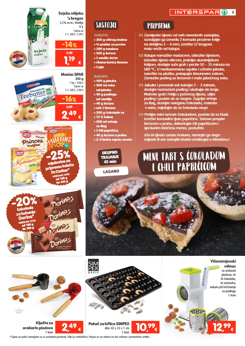 01 zamijesite tijesto od svih navedenih sastojaka, razvaljajte ga između 2 komada prozirne folije na debljinu 3 – 4 mm, izrežite 12 krugova malo većih od kalupa. 02 kalupe namažite maslacem, obložite tijestom, izbodite tijesto vilicom, pokrijte aluminijskom folijom, dodajte suhi grah i pecite 10 – 15 minuta na 180 °c. u međuvremenu ogulite i očistite jabuke, narežite na ploške, pokapajte limunovim sokom. zamutite puding sa šećerom i malo jabučnog soka. 03 jabuke i preostali sok kuhajte 2 – 3 minute, dodajte razmućeni puding i skuhajte do kraja. maknite grah i foliju s pečenog tijesta, ulijte puding i pustite da se stegne. zagrijte vrhnje za šlag, dodajte natrganu čokoladu, maknite s vatre, miješajte da se čokolada otopi. 04 prelijte mini tartove čokoladom, pustite da se hladi. izrežite komadiće ljute papričice. tartove pospite šećerom u prahu, dekorirajte čili papričicom i sjeckanim listićima mente, poslužite. (da bi tijesto ostalo hrskavo, nemojte ga dugo mijesiti ili sve sastojke kratko izmiksajte u blenderu.) priprema sastojci ukupno trajanje 45 min lagano tijesto: • 300 g oštrog brašna • ½ praška za pecivo • 200 g maslaca • 100 g šećera • 1 vanilin šećer • ribana korica limuna • 1 jaje nadjev: • 400 g jabuka • 300 ml soka od jabuka • 40 g pudinga od vanilije • 40 g šećera • sok 1 limuna • 200 g čokolade sa • 72 % kakaa • 200 ml vrhnja za šlag • 1 čili papričica • 40 g šećera u prahu • 2-3 listića svježe mente mini tart s čokoladom i chili papričicom *cijene na polici umanjene su za navedeni postotak. slika je simbolična. popust se ne odnosi na već snižene i promotivne artikle. klješta za orašaste plodove 1 kom višenamjenski mlinac za orašaste plodove, sir ili čokoladu, tri nastavka, vakum pričvršćivanje za podlogu 1 kom 2 , 49 € pekač za kiflice simpex dim: 42 x 32 x 1 cm 1 kom 10 , 99 € -20 % čokolada za kuhanje dorina* odabrane vrste od 100 g do 300 g 12 , 99 € svježe mlijeko ‘z bregov 3,2% m.m., vindija 1 l cijena na 2. 5. 2025.: 1,39 € -25 % mješavine za pripremu kolača dr.oetker* odabrane vrste od 160 g do 436 g 1,39 1 , 19 € -14 % maslac spar 250 g 1 kg = 9,96 € cijena na 2. 5. 2025.: 2,99 € 2,99 2 , 49 € -16 % 3