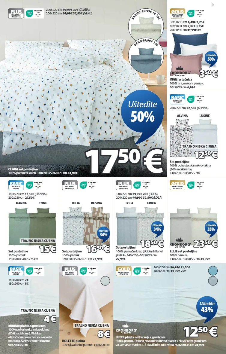 s a b i n e 2 9 , 9 9 € 1 8 , 5 0 € g e r d 2 9 , 9 9 € 2 0 € 9 clara set posteljine 100% pamučni saten. 140x200+50x70/75 cm 34,99€ 9 7 6 - 1 4 6 0 1 d t i plus udobnost i kvaliteta 200x220 cm 59,99€ 30€ (clara) 200x220 cm 54,99€ 37,50€ (gerd) 17 17 50 50 € € uštedite 50% jette plahta od žerseja s gumicom 100% pamuk. debela, visokokvalitetna plahta s elastičnom gumicom za sve vrste madraca. s elastičnim rubovima. 90x200x35 cm 21,99€ 9 7 6 - 1 4 6 0 1 d t i gold ekskluzivna kvaliteta 160x200 cm 36,99€ 21,50€ 180x200 cm 44,99€ 25€ 12 12 50 50 € € uštedite 43% inge jastučnica 100% fini, mekani pamuk. 50x70/75 cm 6,99€ 9 7 6 - 1 4 6 0 1 d t i gold ekskluzivna kvaliteta 30x50x10 cm 4,49€ 2,25€ 40x60x11 cm 7,49€ 3,75€ 70x80/90 cm 11,99€ 6€ 3 3 50 50 € € uštedite 50% set posteljine 100% poliesterska mikrovlakna (50% reciklirana). 140x200+50x70/75 cm 9 7 6 - 1 4 6 0 1 d t i basic najbolja cijena 200x220 cm 22,50€ (alvina) 12 12 50 50 € € trajno niska cijena alvina lusine set posteljine 100% pamuk. 140x200+50x70/75 cm 9 7 6 - 1 4 6 0 1 d t i basic najbolja cijena 140x220 cm 17,50€ (hanna) 200x220 cm 27,50€ 15 15 € € trajno niska cijena tone hanna 9 7 6 - 1 4 6 0 1 d t i plus udobnost i kvaliteta set posteljine 100% pamuk. 140x200+50x70/75 cm 24,99€ 16 16 50 50 € € uštedite 34% julia regina set posteljine 100% pamučni krep (lola) ili flanel (erika). 140x200+50x70/75 cm 27,99€ 9 7 6 - 1 4 6 0 1 d t i plus udobnost i kvaliteta 140x220 cm 29,99€ 20€ (lola) 200x220 cm 49,99€ 32,50€ (lola) 18 18 50 50 € € uštedite 34% lola erika 9 7 6 - 1 4 6 0 1 d t i gold ekskluzivna kvaliteta ellie set posteljine 100% pamuk. 140x200+50x70/75 cm 34,99€ 23 23 50 50 € € uštedite 33% miriam plahta s gumicom 100% poliesterska mikrovlakna (50% reciklirana). plahta s elastičnom gumicom za sve vrste madraca. s elastičnim rubovima. 90x200x25 cm 9 7 6 - 1 4 6 0 1 d t i basic najbolja cijena 160x200 cm 7€ 180x200 cm 8€ 4 4 € € trajno niska cijena 9 7 6 - 1 4 6 0 1 d t i plus udobnost i kvaliteta bolette plahta 100% kvalitetni pamuk. 140x250 cm 8 8 € € trajno niska cijena 1828580 1833980 1829080 1629101 1629136 1629142 1056301 1056321 1056336 7399080 1821780 1829280 1831480 7386980 7398180 1839580 7386680 7398780 7398680 1445001 1439001 1439058