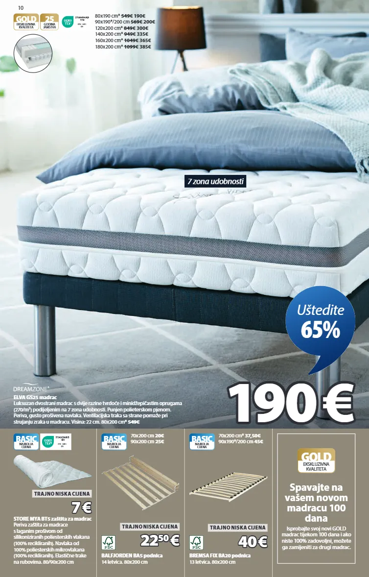 10 elva gs25 madrac luksuzan dvostrani madrac s dvije razine tvrdoće i minidžepičastim oprugama (270/m²) podijeljenim na 7 zona udobnosti. punjen polieterskom pjenom. periva, gusto prošivena navlaka. ventilacijska traka sa strane pomaže pri strujanju zraka u madracu. visina: 22 cm. 80x200 cm* 549€ 9 7 6 - 1 4 6 0 1 d t i gold 25 godina jamstva ekskluzivna kvaliteta 80x190 cm* 549€ 190€ 90x190*/200 cm 569€ 200€ 120x200 cm* 849€ 300€ 140x200 cm* 949€ 335€ 160x200 cm* 1049€ 365€ 180x200 cm* 1099€ 385€ 190 190 € € uštedite 65% 9 7 6 - 1 4 6 0 1 d t i basic najbolja cijena store mya bt5 zaštita za madrac periva zaštita za madrace s laganim prošivom od silikoniziranih poliesterskih vlakana (100% recikliranih). navlaka od 100% poliesterskih mikrovlakana (100% recikliranih). elastične trake na rubovima. 80/90x200 cm 7 7 € € trajno niska cijena balfjorden ba5 podnica 14 letvica. 80x200 cm basic najbolja cijena 70x200 cm 20€ 90x200 cm 25€ 22 22 50 50 € € trajno niska cijena bremsa fix ba20 podnica 13 letvica. 80x200 cm basic najbolja cijena 70x200 cm* 37,50€ 90x190*/200 cm 45€ 40 40 € € trajno niska cijena gold ekskluzivna kvaliteta spavajte na vašem novom madracu 100 dana isprobajte svoj novi gold madrac tijekom 100 dana i ako niste 100% zadovoljni, možete ga zamijeniti za drugi madrac. 7 zona udobnosti 3344823 3427427 3500123 3529023