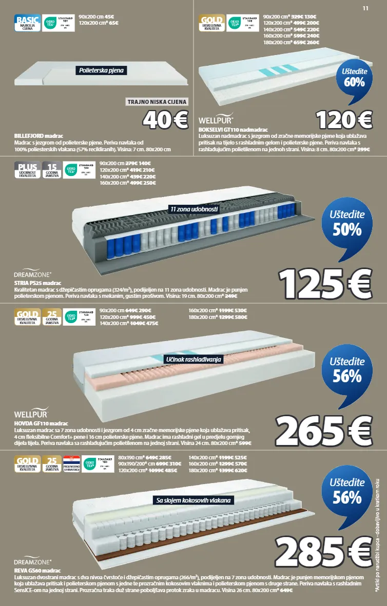 11 polieterska pjena billefjord madrac madrac s jezgrom od polieterske pjene. periva navlaka od 100% poliesterskih vlakana (57% recikliranih). visina: 7 cm. 80x200 cm 9 7 6 - 1 4 6 0 1 d t i basic najbolja cijena 90x200 cm 45€ 120x200 cm* 65€ 40 40 € € trajno niska cijena 11 zona udobnosti stria ps25 madrac kvalitetan madrac s džepičastim oprugama (324/m²), podijeljen na 11 zona udobnosti. madrac je punjen polieterskom pjenom. periva navlaka s mekanim, gustim prošivom. visina: 19 cm. 80x200 cm* 249€ 9 7 6 - 1 4 6 0 1 d t i plus udobnost i kvaliteta 15 godina jamstva 90x200 cm 279€ 140€ 120x200 cm* 419€ 210€ 140x200 cm* 439€ 220€ 160x200 cm* 499€ 250€ 125 125 € € uštedite 50% učinak rashlađivanja hovda gf110 madrac luksuzan madrac sa 7 zona udobnosti i jezgrom od 4 cm zračne memorijske pjene koja ublažava pritisak, 4 cm fleksibilne comfort+ pene i 16 cm polieterske pjene. madrac ima rashladni gel u predjelu gornjeg dijela tijela. periva navlaka sa rashlađujućim polietilenom na jednoj strani. visina 24 cm. 80x200 cm* 599€ 9 7 6 - 1 4 6 0 1 d t i gold 25 godina jamstva ekskluzivna kvaliteta 90x200 cm 649€ 290€ 120x200 cm* 999€ 450€ 140x200 cm* 1049€ 475€ 265 265 € € uštedite 56% sa slojem kokosovih vlakana reva gs60 madrac luksuzan dvostrani madrac s dva nivoa čvrstoće i džepičastim oprugama (266/m²), podijeljen na 7 zona udobnosti. madrac je punjen memorijskom pjenom koja ublažava pritisak i polieterskom pjenom s jedne te prozračnim kokosovim vlaknima i polieterskom pjenom s druge strane. periva navlaka s rashladnim sensice-om na jednoj strani. prozračna traka duž strane poboljšava protok zraka u madracu. visina 26 cm. 80x200 cm* 649€ 285 285 € € uštedite 56% 9 7 6 - 1 4 6 0 1 d t i gold 25 godina jamstva ekskluzivna kvaliteta proizvedeno u hrvatskoj 80x190 cm* 649€ 285€ 90x190/200* cm 699€ 310€ 120x200 cm* 1099€ 485€ 140x200 cm* 1199€ 525€ 160x200 cm* 1299€ 570€ 180x200 cm* 1399€ 620€ *artikl po narudžbi kupca - dobavljivo u kratkom roku 160x200 cm* 1199€ 530€ 180x200 cm* 1299€ 580€ bokselvi gt110 nadmadrac luksuzan nadmadrac s jezgrom od zračne memorijske pjene koja ublažava pritisak na tijelo s rashladnim gelom i polieterske pjene. periva navlaka s rashlađujućim polietilenom na jednoh strani. visina: 8 cm. 80x200 cm* 299€ 9 7 6 - 1 4 6 0 1 d t i gold ekskluzivna kvaliteta 90x200 cm* 329€ 130€ 120x200 cm* 499€ 200€ 140x200 cm* 549€ 220€ 160x200 cm* 599€ 240€ 180x200 cm* 659€ 260€ uštedite 60% 120 120 € € 3271023 3264323 3260423 3387923 3441523