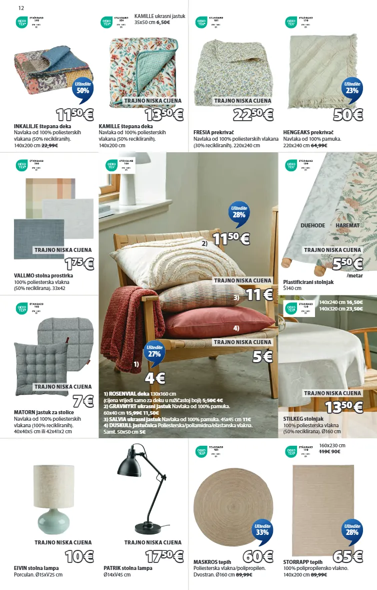 12 9 7 6 - 1 4 6 0 1 d t i inkalilje štepana deka navlaka od 100% poliesterskih vlakana (50% recikliranih). 140x200 cm 22,99€ 11 11 50 50 € € uštedite 50% kamille štepana deka navlaka od 100% poliesterskih vlakana (50% recikliranih). 140x200 cm 9 7 6 - 1 4 6 0 1 d t i kamille ukrasni jastuk 35x50 cm 6,50€ 13 13 50 50 € € trajno niska cijena 9 7 6 - 1 4 6 0 1 d t i fresia prekrivač navlaka od 100% poliesterskih vlakana (30% recikliranih). 220x240 cm 22 22 50 50 € € trajno niska cijena 9 7 6 - 1 4 6 0 1 d t i hengeaks prekrivač navlaka od 100% pamuka. 220x240 cm 64,99€ 50 50 € € uštedite 23% 9 7 6 - 1 4 6 0 1 d t i 1) rosenvial deka 130x160 cm (cijena vrijedi samo za deku u ružičastoj boji) 5,50€ 4€ 2) gravmyrt ukrasni jastuk navlaka od 100% pamuka. 60x40 cm 15,99€ 11,50€ 3) salvia ukrasni jastuk navlaka od 100% pamuka. 45x45 cm 11€ 4) duskull jastučnica poliesterska/poliamidna/elastanska vlakna. samt. 50x50 cm 5€ 4 4 € € uštedite 27% 4) 5 5 € € trajno niska cijena 3) 11 11 € € trajno niska cijena 2) 11 11 50 50 € € uštedite 28% 1) eivin stolna lampa porculan. ø15xv25 cm 10 10 € € trajno niska cijena patrik stolna lampa ø14xv45 cm 17 17 50 50 € € trajno niska cijena 9 7 6 - 1 4 6 0 1 d t i maskros tepih poliesterska vlakna/polipropilen. dvostran. ø160 cm 89,99€ 60 60 € € uštedite 33% storrapp tepih 100% polipropilensko vlakno. 140x200 cm 89,99€ 9 7 6 - 1 4 6 0 1 d t i 160x230 cm 119€ 90€ 65 65 € € uštedite 28% 9 7 6 - 1 4 6 0 1 d t i vallmo stolna prostirka 100% poliesterska vlakna (50% reciklirana). 33x42 1 1 75 75 € € trajno niska cijena 9 7 6 - 1 4 6 0 1 d t i plastificirani stolnjak š140 cm /metar 5 5 50 50 € € trajno niska cijena duehode haremat 9 7 6 - 1 4 6 0 1 d t i matorn jastuk za stolice navlaka od 100% poliesterskih vlakana (100% recikliranih). 40x40x5 cm ili 42x41x2 cm 7 7 € € trajno niska cijena stilkeg stolnjak 100% poliesterska vlakna (50% reciklirana). ø160 cm 9 7 6 - 1 4 6 0 1 d t i 140x240 cm 16,50€ 140x320 cm 23,50€ 13 13 50 50 € € trajno niska cijena 4537900 4542468 4611866 4614344 6878218 6867600 6873744 4541918 4912450 4911413 6509400 6517344 1717001 1717007 1733341 5701454 5703800 6875458 6874558 1762844