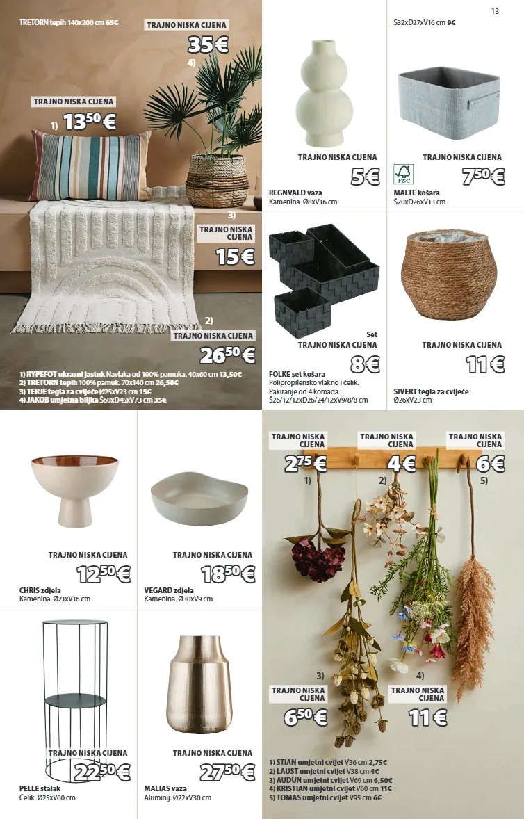 13 11 11 € € trajno niska cijena 1) rypefot ukrasni jastuk navlaka od 100% pamuka. 40x60 cm 13,50€ 2) tretorn tepih 100% pamuk. 70x140 cm 26,50€ 3) terje tegla za cvijeće ø25xv23 cm 15€ 4) jakob umjetna biljka š60xd45xv73 cm 35€ 13 13 50 50 € € trajno niska cijena 4) 35 35 € € trajno niska cijena 3) 15 15 € € trajno niska cijena tretorn tepih 140x200 cm 65€ 2) 26 26 50 50 € € trajno niska cijena 1) 1) stian umjetni cvijet v36 cm 2,75€ 2) laust umjetni cvijet v38 cm 4€ 3) audun umjetni cvijet v69 cm 6,50€ 4) kristian umjetni cvijet v60 cm 11€ 5) tomas umjetni cvijet v95 cm 6€ 5) 6 6 € € trajno niska cijena 4) 1) 2 2 75 75 € € trajno niska cijena 2) 3) 6 6 50 50 € € trajno niska cijena 4 4 € € trajno niska cijena regnvald vaza kamenina. ø8xv16 cm 5 5 € € trajno niska cijena folke set košara polipropilensko vlakno i čelik. pakiranje od 4 komada. š26/12/12xd26/24/12xv9/8/8 cm 8 8 € € set trajno niska cijena malte košara š20xd26xv13 cm š32xd27xv16 cm 9€ 7 7 50 50 € € trajno niska cijena sivert tegla za cvijeće ø26xv23 cm 11 11 € € trajno niska cijena chris zdjela kamenina. ø21xv16 cm 12 12 50 50 € € trajno niska cijena vegard zdjela kamenina. ø30xv9 cm 18 18 50 50 € € trajno niska cijena pelle stalak čelik. ø25xv60 cm 22 22 50 50 € € trajno niska cijena malias vaza aluminij. ø22xv30 cm 27 27 50 50 € € trajno niska cijena 6879800 4912522 4911852 6511174 4911859 4912317 4912157 4912419 4912214 4912430 3818143 4912626 4912559 4911240 4912319 4912337 4911712