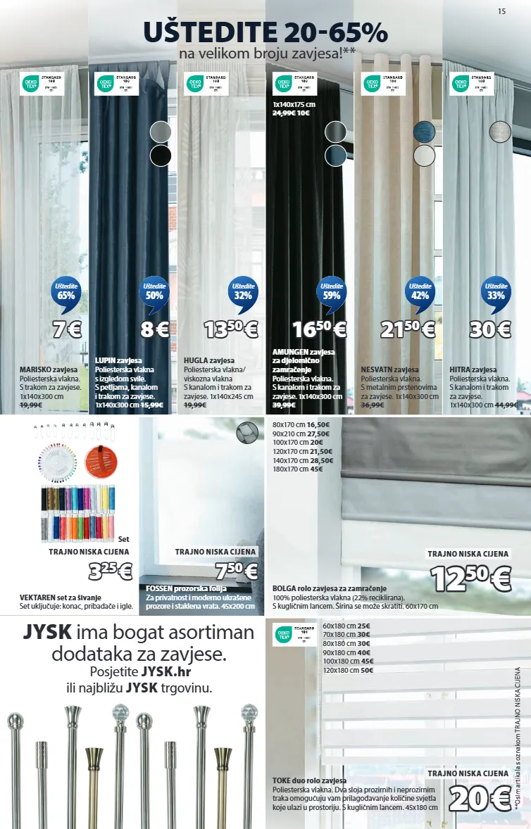 15 uštedite 20-65% na velikom broju zavjesa!** bolga rolo zavjesa za zamračenje 100% poliesterska vlakna (22% reciklirana). s kugličnim lancem. širina se može skratiti. 60x170 cm 80x170 cm 16,50€ 90x210 cm 27,50€ 100x170 cm 20€ 120x170 cm 21,50€ 140x170 cm 28,50€ 180x170 cm 45€ 12 12 50 50 € € trajno niska cijena jysk ima bogat asortiman dodataka za zavjese. posjetite jysk.hr ili najbližu jysk trgovinu. toke duo rolo zavjesa poliesterska vlakna. dva sloja prozirnih i neprozirnim traka omogućuju vam prilagođavanje količine svjetla koje ulazi u prostoriju. s kugličnim lancem. 45x180 cm 9 7 6 - 1 4 6 0 1 d t i 60x180 cm 25€ 70x180 cm 30€ 80x180 cm 30€ 90x180 cm 40€ 100x180 cm 45€ 120x180 cm 50€ 20 20 € € trajno niska cijena vektaren set za šivanje set uključuje: konac, pribadače i igle. 3 3 25 25 € € set trajno niska cijena fossen prozorska folija za privatnost i moderno ukrašene prozore i staklena vrata. 45x200 cm 7 7 50 50 € € trajno niska cijena **osim artikala s oznakom trajno niska cijena 9 7 6 - 1 4 6 0 1 d t i hitra zavjesa poliesterska vlakna. s kanalom i trakom za zavjese. 1x140x300 cm 44,99€ 9 7 6 - 1 4 6 0 1 d t i nesvatn zavjesa poliesterska vlakna. s metalnim prstenovima za zavjese. 1x140x300 cm 36,99€ 21 21 50 50 € € uštedite 42% 30 30 € € uštedite 33% 9 7 6 - 1 4 6 0 1 d t i 1x140x175 cm 24,99€ 10€ amungen zavjesa za djelomično zamračenje poliesterska vlakna. s kanalom i trakom za zavjese. 1x140x300 cm 39,99€ 16 16 50 50 € € uštedite 59% 9 7 6 - 1 4 6 0 1 d t i hugla zavjesa poliesterska vlakna/ viskozna vlakna s kanalom i trakom za zavjese. 1x140x245 cm 19,99€ 13 13 50 50 € € uštedite 32% 9 7 6 - 1 4 6 0 1 d t i lupin zavjesa poliesterska vlakna s izgledom svile. s petljama, kanalom i trakom za zavjese. 1x140x300 cm 15,99€ 8 8 € € uštedite 50% 9 7 6 - 1 4 6 0 1 d t i marisko zavjesa poliesterska vlakna. s trakom za zavjese. 1x140x300 cm 19,99€ 7 7 € € uštedite 65% 5530833 5532500 5808501 5087001 5087004 5095707 5086838 5086802 5095744 5086807 5092136 5091342 5093726 5093660 5078801 5080040 5098401 5091940 5219700
