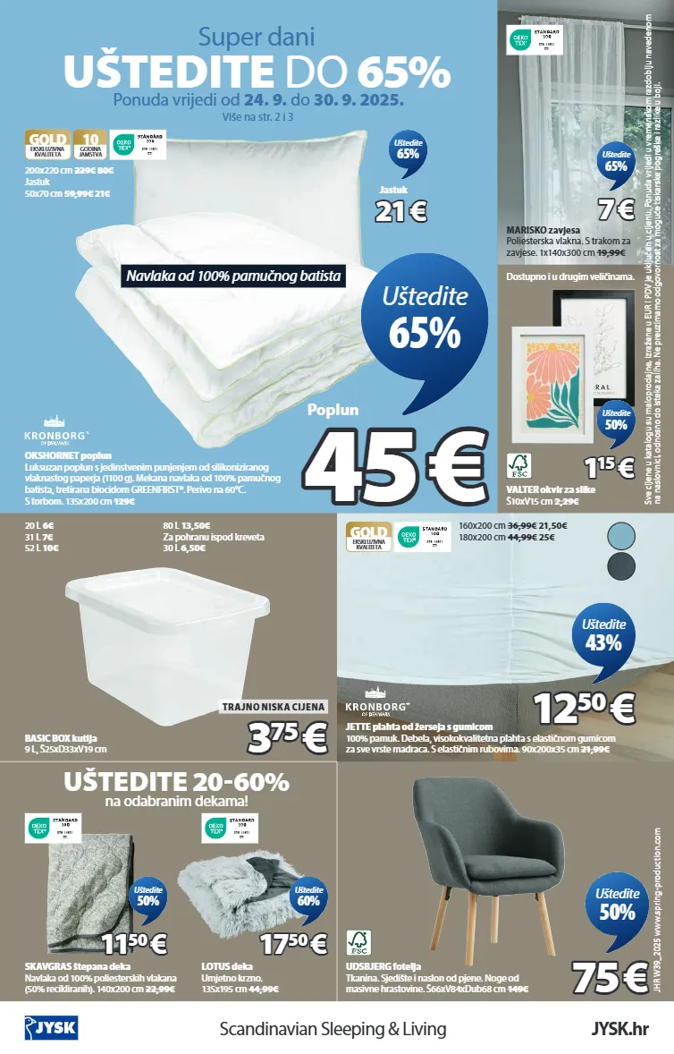 scandinavian sleeping & living jysk.hr jhr w39_2025 www.spring-production.com basic box kutija 9 l, š25xd33xv19 cm 20 l 6€ 31 l 7€ 52 l 10€ 3 3 75 75 € € trajno niska cijena jette plahta od žerseja s gumicom 100% pamuk. debela, visokokvalitetna plahta s elastičnom gumicom za sve vrste madraca. s elastičnim rubovima. 90x200x35 cm 21,99€ 9 7 6 - 1 4 6 0 1 d t i gold ekskluzivna kvaliteta 160x200 cm 36,99€ 21,50€ 180x200 cm 44,99€ 25€ 12 12 50 50 € € uštedite 43% 9 7 6 - 1 4 6 0 1 d t i skavgras štepana deka navlaka od 100% poliesterskih vlakana (50% recikliranih). 140x200 cm 22,99€ 11 11 50 50 € € uštedite 50% 9 7 6 - 1 4 6 0 1 d t i lotus deka umjetno krzno. 135x195 cm 44,99€ 17 17 50 50 € € uštedite 60% udsbjerg fotelja tkanina. sjedište i naslon od pjene. noge od masivne hrastovine. š66xv84xdub68 cm 149€ 75 75 € € uštedite 50% 9 7 6 - 1 4 6 0 1 d t i marisko zavjesa poliesterska vlakna. s trakom za zavjese. 1x140x300 cm 19,99€ 7 7 € € uštedite 65% valter okvir za slike š10xv15 cm 2,29€ dostupno i u drugim veličinama. 1 1 15 15 € € uštedite 50% sve cijene u katalogu su maloprodajne, izražene u eur i pdv je uključen u cijenu. ponuda vrijedi u vremenskom razdoblju navedenom na naslovnici, odnosno do isteka zaliha. ne preuzimamo odgovornost za moguće tiskarske pogreške i razlike u boji. super dani uštedite do 65% ponuda vrijedi od 24. 9. do 30. 9. 2025. više na str. 2 i 3 okshornet poplun luksuzan poplun s jedinstvenim punjenjem od silikoniziranog vlaknastog paperja (1100 g). mekana navlaka od 100% pamučnog batista, tretirana biocidom greenfirst®. perivo na 60°c. s torbom. 135x200 cm 129€ 9 7 6 - 1 4 6 0 1 d t i gold 10 godina jamstva ekskluzivna kvaliteta 200x220 cm 229€ 80€ jastuk 50x70 cm 59,99€ 21€ 45 45 € € poplun uštedite 65% 21 21 € € jastuk uštedite 65% navlaka od 100% pamučnog batista uštedite 20-60% na odabranim dekama! 80 l 13,50€ za pohranu ispod kreveta 30 l 6,50€ 4922008 1629101 1629136 1629142 4540644 4538400 3690351 5080040 4912247 4911957 4049550 4249504