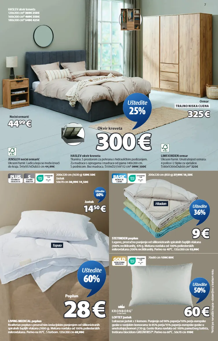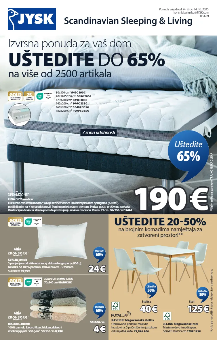 scandinavian sleeping & living ponuda vrijedi od 24. 9. do 14. 10. 2025. korisnickasluzba@jysk.com jysk.hr elva gs25 madrac luksuzan dvostrani madrac s dvije razine tvrdoće i minidžepičastim oprugama (270/m²) podijeljenim na 7 zona udobnosti. punjen polieterskom pjenom. periva, gusto prošivena navlaka. ventilacijska traka sa strane pomaže pri strujanju zraka u madracu. visina: 22 cm. 80x200 cm* 549€ 9 7 6 - 1 4 6 0 1 d t i gold 25 godina jamstva ekskluzivna kvaliteta 80x190 cm* 549€ 190€ 90x190*/200 cm 569€ 200€ 120x200 cm* 849€ 300€ 140x200 cm* 949€ 335€ 160x200 cm* 1049€ 365€ 180x200 cm* 1099€ 385€ 190 190 € € uštedite 65% uštedite 20-50% na brojnim komadima namještaja za zatvoreni prostor!** jegind blagovaonski stol masivno drvo i medijapan. š80xd130xv75 cm 179€ 125€ 125 125 € € stol uštedite 30% kastrup blagovaonska stolica oblikovano sjedalo i masivna hrastovina. s pričvršćenim jastukom od umjetne kože. 79,99€ 40€ 40 40 € € stolica uštedite 50% 9 7 6 - 1 4 6 0 1 d t i gold ekskluzivna kvaliteta svalia jastuk s punjenjem od silikoniziranog vlaknastog paperja (900 g). navlaka od 100% pamuka. perivo na 60°c. s torbom. 50x70 cm 59,99€ 24 24 € € uštedite 60% malung ručnik 100% pamuk, žakard-tkan. mekan, debeo i visokoupijajući. 500 g/m². 50x100 cm 9,99€ 9 7 6 - 1 4 6 0 1 d t i gold ekskluzivna kvaliteta 30x50 cm 3,49€ 1,75€ 70x140 cm 18,99€ 8€ 4 4 € € 50x100 cm uštedite 60% izvrsna ponuda za vaš dom uštedite do 65% na više od 2500 artikala *artikl po narudžbi kupca - dobavljivo u kratkom roku **osim artikala s oznakom trajno niska cijena 7 zona udobnosti 3344823 3640160 3640146 4329304 2139302