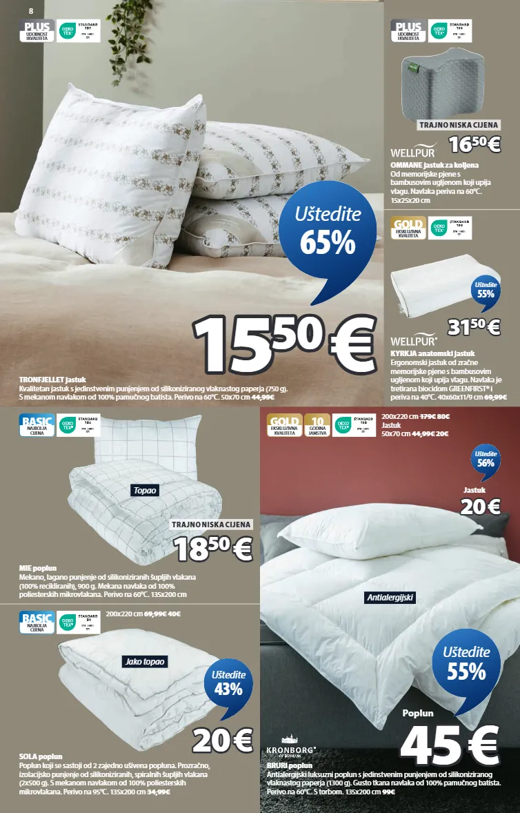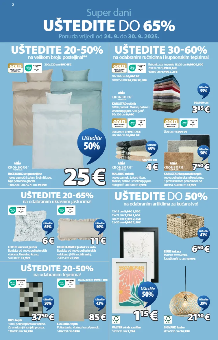 2 super dani uštedite do 65% ponuda vrijedi od 24. 9. do 30. 9. 2025. uštedite 20-50% na velikom broju posteljina!** uštedite do 50% na odabranim artiklima za kućanstvo! ingeborg set posteljine 100% pamučni saten. broj niti 300. nije potrebno glačati. 140x200+50x70/75 cm 49,99€ 9 7 6 - 1 4 6 0 1 d t i gold ekskluzivna kvaliteta 200x220 cm 89€ 45€ 25 25 € € uštedite 50% uštedite 30-60% na odabranim ručnicima i kupaonskim tepisima! karlstad ručnik 100% pamuk. mekan, debeo i visokoupijajući. 500 g/m². 50x100 cm 8,49€ 3 3 85 85 € € 50x100 cm uštedite 55% uštedite 20-65% na odabranim ukrasnim jastucima! uštedite 20-50% na odabranim tepisima! 9 7 6 - 1 4 6 0 1 d t i lotus ukrasni jastuk navlaka od 100% poliesterskih vlakana. umjetno krzno. 50x50 cm 16,99€ 6 6 € € uštedite 65% 9 7 6 - 1 4 6 0 1 d t i dunhammer jastuk za leđa navlaka od 100% poliesterskih valakana (50% recikliranih). 75x35 cm 21,99€ 11 11 € € uštedite 50% valter okvir za slike š10xv15 cm 2,29€ 13x18 cm 2,99€ 1,50€ 15x21 cm 3,29€ 1,65€ 18x24 cm 4,49€ 2,25€ 21x30 cm 4,99€ 2,50€ 1 1 15 15 € € uštedite 50% eirik košara morska trava/čelik. š20xd30xv15 cm 10,99€ 6 6 50 50 € € uštedite 41% sigvard luster ø35xv26 cm 34,99€ 21 21 50 50 € € uštedite 39% 9 7 6 - 1 4 6 0 1 d t i rips tepih 100% polipropilensko vlakno. za unutarnji i vanjski prostor. 130x193 cm 74,99€ 37 37 50 50 € € uštedite 50% lucerne tepih poliesterska vlakna/vuna/pamuk. 140x200 cm 149€ 9 7 6 - 1 4 6 0 1 d t i 160x230 cm 199€ 110€ 85 85 € € uštedite 43% malung ručnik 100% pamuk, žakard-tkan. mekan, debeo i visokoupijajući. 500 g/m². 50x100 cm 9,99€ 9 7 6 - 1 4 6 0 1 d t i gold ekskluzivna kvaliteta 30x50 cm 3,49€ 1,75€ 70x140 cm 18,99€ 8€ 4 4 € € 50x100 cm uštedite 60% 9 7 6 - 1 4 6 0 1 d t i gold ekskluzivna kvaliteta rukavica za kupanje 15x20 cm 0,99€ 0,50€ 28x30 cm 1,39€ 0,65€ 40x60 cm 4,49€ 2,25€ 70x140 cm 16,99€ 8€ 100x150 cm 24,99€ 12,50€ karlstad kupaonski tepih 100% poliesterska mikrovlakna. s protukliznom poleđinom od lateksa. 50x80 cm 14,99€ 9 7 6 - 1 4 6 0 1 d t i gold ekskluzivna kvaliteta ø70 cm 17,99€ 9€ 7 7 50 50 € € uštedite 50% 7339880 7339780 7340080 2116439 4848763 6815619 4911026 4912492 4912247 4911957 5897002 6513244 6514942 2139302 2510300 2510307 2510342 2510358