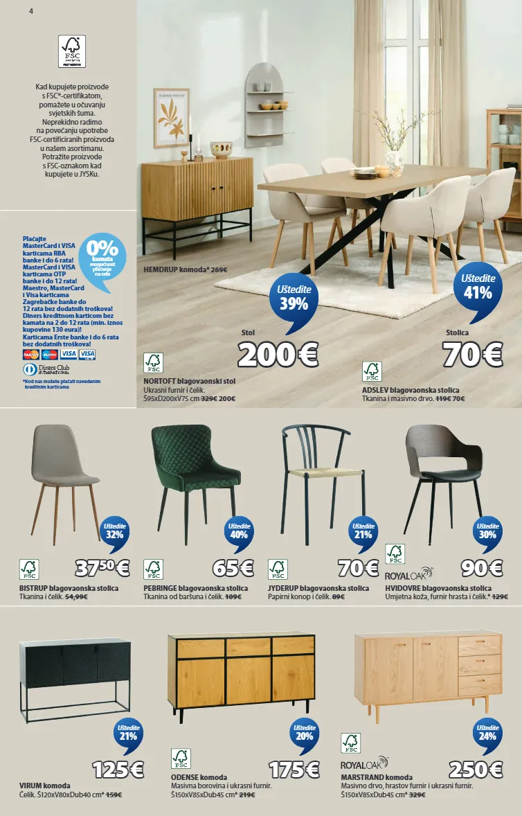 4 nortoft blagovaonski stol ukrasni furnir i čelik. š95xd200xv75 cm 329€ 200€ 200 200 € € stol uštedite 39% hemdrup komoda* 269€ adslev blagovaonska stolica tkanina i masivno drvo. 119€ 70€ 70 70 € € stolica uštedite 41% bistrup blagovaonska stolica tkanina i čelik. 54,99€ 37 37 50 50 € € uštedite 32% jyderup blagovaonska stolica papirni konop i čelik. 89€ 70 70 € € uštedite 21% pebringe blagovaonska stolica tkanina od baršuna i čelik. 109€ 65 65 € € uštedite 40% hvidovre blagovaonska stolica umjetna koža, furnir hrasta i čelik.* 129€ 90 90 € € uštedite 30% virum komoda čelik. š120xv80xdub40 cm* 159€ 125 125 € € uštedite 21% odense komoda masivna borovina i ukrasni furnir. š150xv85xdub45 cm* 219€ 175 175 € € uštedite 20% marstrand komoda masivno drvo, hrastov furnir i ukrasni furnir. š150xv85xdub45 cm* 329€ 250 250 € € uštedite 24% kad kupujete proizvode s fsc®-certifikatom, pomažete u očuvanju svjetskih šuma. neprekidno radimo na povećanju upotrebe fsc-certificiranih proizvoda u našem asortimanu. potražite proizvode s fsc-oznakom kad kupujete u jysku. 0% kamata mogućnost plaćanja na rate *kod nas možete plaćati navedenim kreditnim karticama plaćajte mastercard i visa karticama rba banke i do 6 rata! mastercard i visa karticama otp banke i do 12 rata! maestro, mastercard i visa karticama zagrebačke banke do 12 rata bez dodatnih troškova! diners kreditnom karticom bez kamata na 2 do 12 rata (min. iznos kupovine 130 eura)! karticama erste banke i do 6 rata bez dodatnih troškova! 3670025 3670352 3601365 3620259 3640136 3640119 3670341 3600734 3670357 3670414