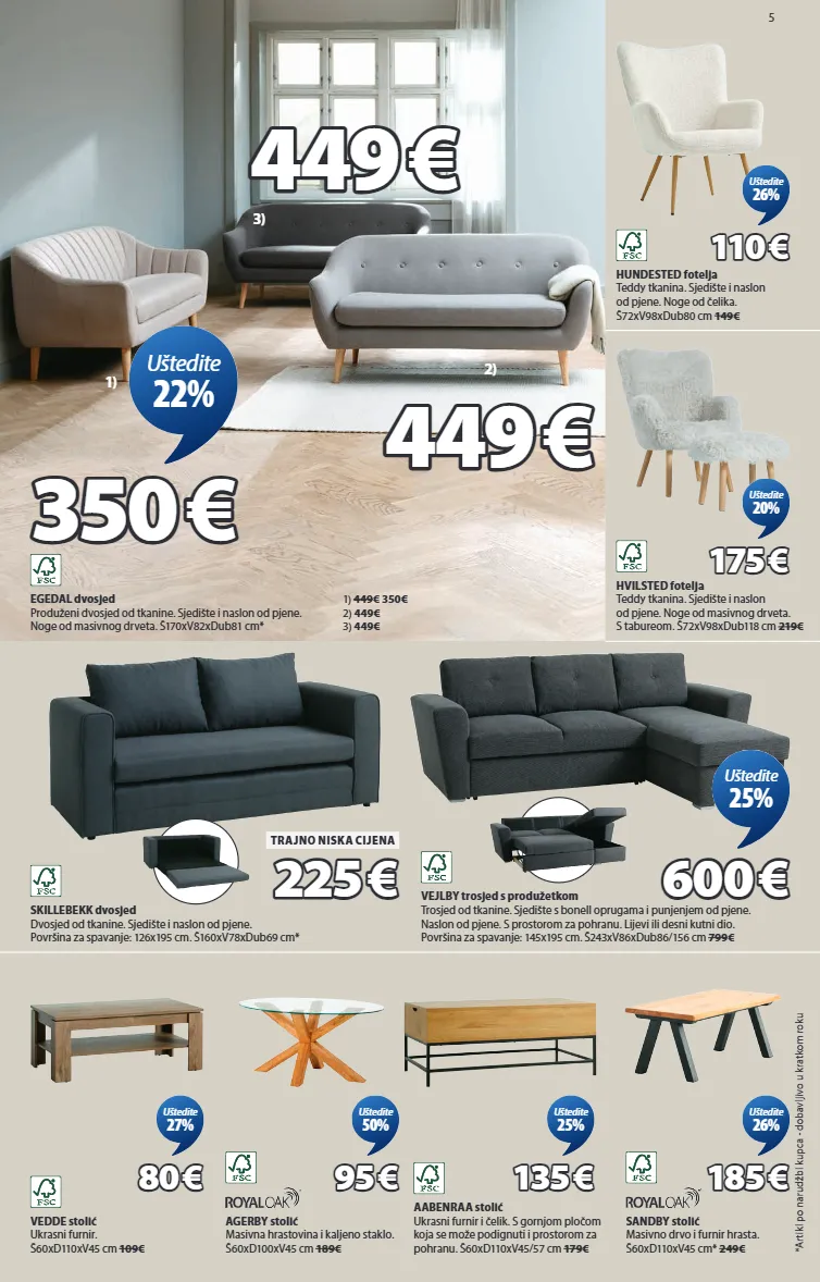 5 egedal dvosjed produženi dvosjed od tkanine. sjedište i naslon od pjene. noge od masivnog drveta. š170xv82xdub81 cm* 350 350 € € uštedite 22% 3) 449 449 € € 449 449 € € 1) 2) skillebekk dvosjed dvosjed od tkanine. sjedište i naslon od pjene. površina za spavanje: 126x195 cm. š160xv78xdub69 cm* 225 225 € € trajno niska cijena vejlby trosjed s produžetkom trosjed od tkanine. sjedište s bonell oprugama i punjenjem od pjene. naslon od pjene. s prostorom za pohranu. lijevi ili desni kutni dio. površina za spavanje: 145x195 cm. š243xv86xdub86/156 cm 799€ 600 600 € € uštedite 25% vedde stolić ukrasni furnir. š60xd110xv45 cm 109€ 80 80 € € uštedite 27% agerby stolić masivna hrastovina i kaljeno staklo. š60xd100xv45 cm 189€ 95 95 € € uštedite 50% aabenraa stolić ukrasni furnir i čelik. s gornjom pločom koja se može podignuti i prostorom za pohranu. š60xd110xv45/57 cm 179€ 135 135 € € uštedite 25% sandby stolić masivno drvo i furnir hrasta. š60xd110xv45 cm* 249€ 185 185 € € uštedite 26% hundested fotelja teddy tkanina. sjedište i naslon od pjene. noge od čelika. š72xv98xdub80 cm 149€ 110 110 € € uštedite 26% hvilsted fotelja teddy tkanina. sjedište i naslon od pjene. noge od masivnog drveta. s tabureom. š72xv98xdub118 cm 219€ 175 175 € € uštedite 20% *artikl po narudžbi kupca - dobavljivo u kratkom roku 1) 449€ 350€ 2) 449€ 3) 449€ 3670069 3699086 3699096 3600108 3690380 3690444 3601174 3670088 3601296 3690285 3640200