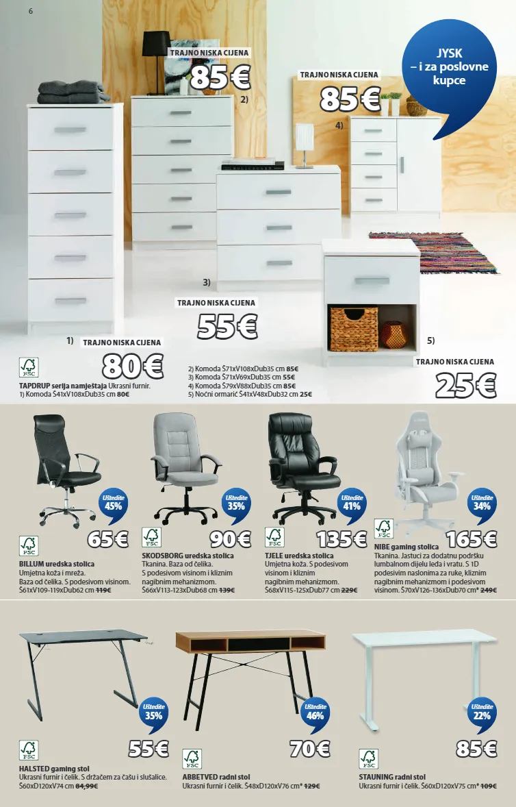 6 80 80 € € trajno niska cijena 25 25 € € trajno niska cijena tapdrup serija namještaja ukrasni furnir. 1) komoda š41xv108xdub35 cm 80€ 5) 4) 85 85 € € trajno niska cijena 3) 55 55 € € trajno niska cijena 2) 85 85 € € trajno niska cijena 1) billum uredska stolica umjetna koža i mreža. baza od čelika. s podesivom visinom. š61xv109-119xdub62 cm 119€ 65 65 € € uštedite 45% skodsborg uredska stolica tkanina. baza od čelika. s podesivom visinom i kliznim nagibnim mehanizmom. š66xv113-123xdub68 cm 139€ 90 90 € € uštedite 35% tjele uredska stolica umjetna koža. s podesivom visinom i kliznim nagibnim mehanizmom. š68xv115-125xdub77 cm 229€ 135 135 € € uštedite 41% jysk – i za poslovne kupce stauning radni stol ukrasni furnir i čelik. š60xd120xv75 cm* 109€ 85 85 € € uštedite 22% abbetved radni stol ukrasni furnir i čelik. š48xd120xv76 cm* 129€ 70 70 € € uštedite 46% halsted gaming stol ukrasni furnir i čelik. s držačem za čašu i slušalice. š60xd120xv74 cm 84,99€ 55 55 € € uštedite 35% 2) komoda š71xv108xdub35 cm 85€ 3) komoda š71xv69xdub35 cm 55€ 4) komoda š79xv88xdub35 cm 85€ 5) noćni ormarić š41xv48xdub32 cm 25€ nibe gaming stolica tkanina. jastuci za dodatnu podršku lumbalnom dijelu leđa i vratu. s 1d podesivim naslonima za ruke, kliznim nagibnim mehanizmom i podesivom visinom. š70xv126-136xdub70 cm* 249€ 165 165 € € uštedite 34% 3659499 3659497 3659494 3659488 3659495 3601323 3690247 3690253 3670090 3600497 3600634 3640196