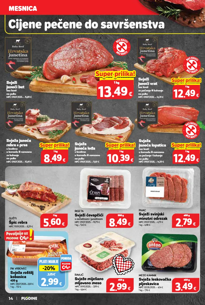 gušti špic rebra mpc 19.09.2025. = 8,29 € svježa juneća rebra ili prsa s kostima u komadu ili narezana za kuhanje na pultu mpc 09.07.2025. = 10,49 € svježa juneća leđa s kostima u komadu ili narezana na pultu mpc 09.07.2025. = 11,69 € rigeta svježi ćevapčići s ovčetinom i junetinom mpc 09.07.2025. = 10,79 € 1 kg = 9,43 € svježi juneći vrat bez kosti za pečenje ili kuhanje na pultu mpc 09.07.2025. = 14,39 € ravlić svježe miješano mljeveno meso mpc 09.10.2025. = 3,99 € 1 kg = 6,64 € meso kamnik svježa leskovačka pljeskavica mpc 02.05.2025. = 4,14 € 1 kg = 7,76 € svježa juneća lopatica bez kosti u komadu ili narezana za pečenje i kuhanje na pultu mpc 09.07.2025. = 14,39 € svježi juneći but bez kosti na pultu mpc 09.07.2025. = 15,89 € pivac svježi svinjski minutni odrezak mpc 09.07.2025. = 4,79 € 1 kg = 6,98 € 5 5 . . 60 60 € 1 kg 8 8 . . 49 49 € 900 g 2 2 . . 99 99 € 450 g 3 3 . . 49 49 € 450 g 2 2 . . 79 79 € 400 g pik vrbovec svježa roštilj kobasica 420 g mpc 28.07.2025.=3,59 € 1 kg = 7,12 € plati manje 3.75 € -20% -20% 2 2 . . 99 99 € ponuda samo u plodinama -16% -16% 2.99 € top cijena! već od hit cijena! 13 13 . . 49 49 € 1 kg super prilika! super prilika! samo u plodinama -16% -16% 2.99 € top cijena! već od hit cijena! 12 12 . . 49 49 € 1 kg super prilika! super prilika! samo u plodinama -16% -16% 2.99 € top cijena! već od hit cijena! 12 12 . . 49 49 € 1 kg super prilika! super prilika! samo u plodinama -16% -16% 2.99 € top cijena! već od hit cijena! 10 10 . . 39 39 € 1 kg super prilika! super prilika! samo u plodinama -16% -16% 2.99 € top cijena! već od hit cijena! 8 8 . . 49 49 € 1 kg super prilika! super prilika! mesnica cijene pečene do savršenstva b e z k o s t i b e z k o s t i b e z k o s t i b e z k o s t i b e z k o s t i b e z k o s t i 14