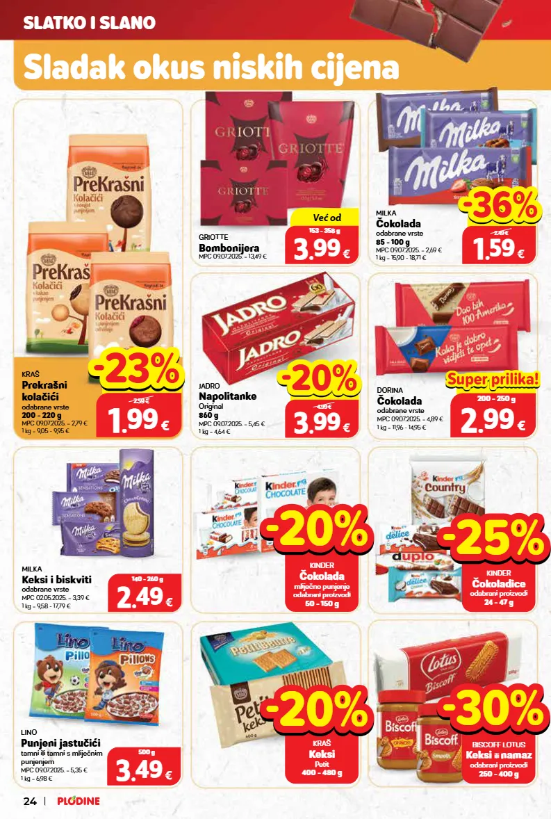 milka čokolada odabrane vrste 85 - 100 g mpc 09.07.2025. = 2,69 € 1 kg = 15,90 - 18,71 € jadro napolitanke original 860 g mpc 09.07.2025. = 5,45 € 1 kg = 4,64 € milka keksi i biskviti odabrane vrste mpc 02.05.2025. = 3,39 € 1 kg = 9,58 - 17,79 € 2 2 . . 49 49 € 140 - 260 g -30% -30% biscoff lotus keksi ili namaz odabrani proizvodi 250 - 400 g -20% -20% kraš keksi petit 400 - 480 g kraš prekrašni kolačići odabrane vrste 200 - 220 g mpc 09.07.2025. = 2,79 € 1 kg = 9,05 - 9,95 € lino punjeni jastučići tamni ili tamni s mliječnim punjenjem mpc 09.07.2025. = 5,35 € 1 kg = 6,98 € dorina čokolada odabrane vrste mpc 09.07.2025. = 4,89 € 1 kg = 11,96 - 14,95 € 3 3 . . 49 49 € 500 g griotte bombonijera mpc 09.07.2025. = 13,49 € hit cijena! super prilika! samo u plodinama 0% 0% 0.00 € top cijena! već od 3 3 . . 99 99 € 153 - 358 g -25% -25% kinder čokoladice odabrani proizvodi 24 - 47 g -20% -20% kinder čokolada mliječno punjenje odabrani proizvodi 50 - 150 g top cijena! već od hit cijena! super prilika! 1 1 . . 99 99 € 200 - 220 g samo u plodinama 2.59 € -23% -23% top cijena! već od hit cijena! super prilika! 1 1 . . 59 59 € 85 - 100 g samo u plodinama 2.49 € -36% -36% samo u plodinama -16% -16% 2.99 € top cijena! već od hit cijena! 2 2 . . 99 99 € 200 - 250 g super prilika! super prilika! top cijena! već od hit cijena! super prilika! 3 3 . . 99 99 € 860 g samo u plodinama 4.99 € -20% -20% slatko i slano sladak okus niskih cijena 24