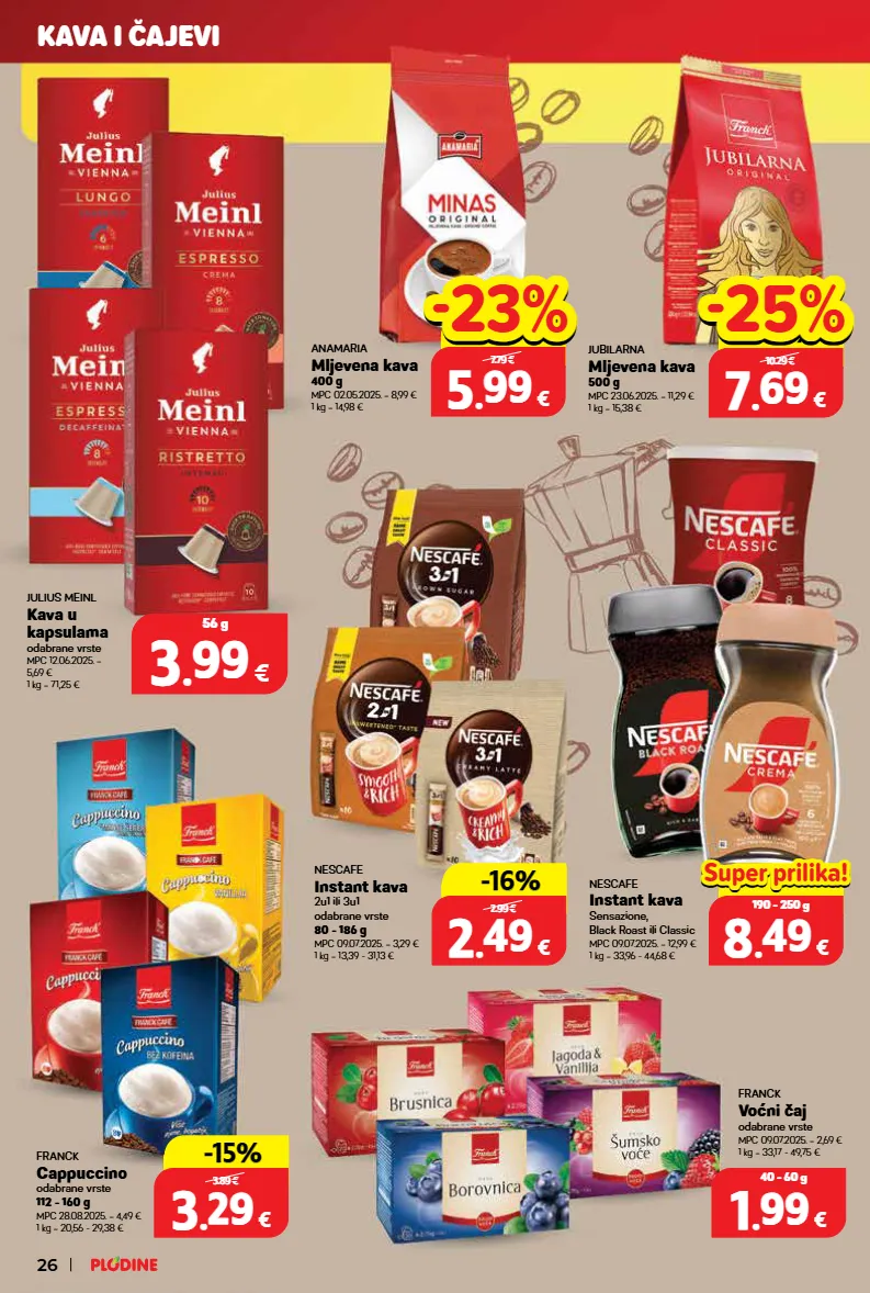 julius meinl kava u kapsulama odabrane vrste mpc 12.06.2025. = 5,69 € 1 kg = 71,25 € 3 3 . . 99 99 € 56 g nescafe instant kava sensazione, black roast ili classic mpc 09.07.2025. = 12,99 € 1 kg = 33,96 - 44,68 € franck voćni čaj odabrane vrste mpc 09.07.2025. = 2,69 € 1 kg = 33,17 - 49,75 € franck cappuccino odabrane vrste 112 - 160 g mpc 28.08.2025. = 4,49 € 1 kg = 20,56 - 29,38 € nescafe instant kava 2u1 ili 3u1 odabrane vrste 80 - 186 g mpc 09.07.2025. = 3,29 € 1 kg = 13,39 - 31,13 € jubilarna mljevena kava 500 g mpc 23.06.2025. = 11,29 € 1 kg = 15,38 € anamaria mljevena kava 400 g mpc 02.05.2025. = 8,99 € 1 kg = 14,98 € 1 1 . . 99 99 € 40 - 60 g top cijena! već od hit cijena! super prilika! 3 3 . . 29 29 € 112 - 160 g samo u plodinama -15% -15% 3.89 € top cijena! već od hit cijena! super prilika! 2 2 . . 49 49 € 80 - 186 g samo u plodinama -16% -16% 2.99 € top cijena! već od hit cijena! super prilika! 5 5 . . 99 99 € 400 g samo u plodinama 7.79 € -23% -23% top cijena! već od hit cijena! super prilika! 7 7 . . 69 69 € 500 g samo u plodinama -22% -22% 10.29 € -25% -25% samo u plodinama -16% -16% 2.99 € top cijena! već od hit cijena! 8 8 . . 49 49 € 190 - 250 g super prilika! super prilika! kava i čajevi 26