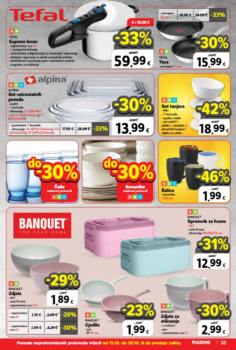6 × 10.00 € top cijena! već od hit cijena! super prilika! 13 13 . . 99 99 € xxxxx samo u plodinama 19.99 € -30% -30% top cijena! već od hit cijena! super prilika! 59 59 . . 99 99 € xxxxx samo u plodinama 89.99 € -33% -33% top cijena! već od hit cijena! super prilika! 15 15 . . 99 99 € xxxxx samo u plodinama 22.99 € -30% -30% top cijena! već od hit cijena! super prilika! 18 18 . . 99 99 € samo u plodinama 32.99 € -42% -42% top cijena! već od hit cijena! super prilika! 2 2 . . 99 99 € samo u plodinama 4.29 € -30% -30% top cijena! već od hit cijena! super prilika! 1 1 . . 99 99 € samo u plodinama 2.59 € -23% -23% top cijena! već od hit cijena! super prilika! 1 1 . . 99 99 € samo u plodinama 3.69 € -46% -46% top cijena! već od hit cijena! super prilika! 12 12 . . 99 99 € xxxxx samo u plodinama 18.99 € -31% -31% top cijena! već od hit cijena! super prilika! 1 1 . . 89 89 € samo u plodinama 2.69 € -29% -29% • pravokutni, 3 komada • dimenzije: 1,6 l (29,5x17,5x5cm), 2,2 l (34,5x20x5), 2,9 l (39x23,5x5cm) -33% 17.99 € 26.99 € • promjera 28 cm -33% 19.99 € 29.99 € • zapremnina cca 4 l -26% 2.19 € 2.99 € • zapremnina cca 6 l -30% 2.99 € 4.29 € ponuda neprehrambenih proizvoda vrijedi od 15.10. do 28.10. ili do prodaje zaliha. 33 keramika odabrani proizvodi -30% -30% do do a b c čaše odabrani proizvodi -30% -30% do do a b c a b c šalica • keramika • 340 ml a b banquet spremnik za hranu • 2u1 • mint ili roza • dimenzija 40x28x17,5 cm a b tefal tava • promjera 24 cm a b tefal express lonac • zapremnine cca 6 l • 2 programa kuhanja • automatsko zaključavanje za otvaranje i zatvaranje • dodatna sigurnost uz ventil za kontrolu pritiska • kontrolirano ispuštanje pare s kontrolom pritiska • pogodno za indukciju a b c set tanjura • nilo • 19 komada • opalno staklo • set sadrži 6 plitkih, 6 dubokih, 6 desertnih tanjura i zdjelu za salatu a b banquet zdjela za miksanje • s ručkom • pvc • zapremnine cca 3 l a b banquet zdjela • pvc • roza ili mint • zapremnina cca 2,5 l a b banquet cjedilo • pvc • ø 20 cm a b c alpina set vatrostalnih posuda • ovalni • 3 komada • dimenzije: 1,6 l (26x18x6 cm), 2,4 l (30x24x6cm), 3 l (35x24x6,50)