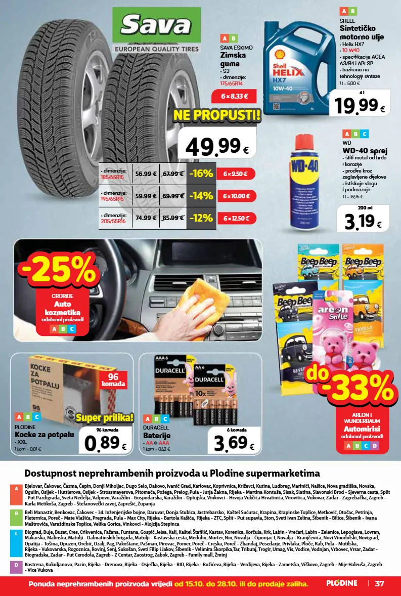 3 3 . . 69 69 € 6 komada -25% -25% croride auto kozmetika odabrani proizvodi a b c 3 3 . . 19 19 € 200 ml 6 × 8.33 € hit cijena! super prilika! samo u plodinama 0% 0% 0.00 € top cijena! 49 49 . . 99 99 € ne propusti ne propusti! ! top cijena! već od hit cijena! 0 0 . . 89 89 € 96 komada super prilika! super prilika! sava eskimo zimska guma • s3 • dimenzije: 175/65r14 a b a b shell sintetičko motorno ulje • helix hx7 • 10 w40 • specifikacije acea a3/b4 i api sp • bazirano na tehnologiji sinteze 1 l = 5,00 € a b c wd wd-40 sprej • štiti metal od hrđe i korozije • prodire kroz zaglavljene dijelove • istiskuje vlagu i podmazuje 1 l = 15,95 € a b c plodine kocke za potpalu • xxl 1 kom = 0,01 € a b c duracell baterije • aa ili aaa 1 kom = 0,62 € 19 19 . . 99 99 € 4 l 6 × 9.50 € 6 × 10.00 € 6 × 12.50 € • dimenzije: 185/65r15 -16% 56.99 € 67.99 € • dimenzije: 195/65r15 -14% 59.99 € 69.99 € • dimenzije: 205/55r16 -12% 74.99 € 85.99 € ponuda neprehrambenih proizvoda vrijedi od 15.10. do 28.10. ili do prodaje zaliha. komada 96 37 beli manastir, benkovac, čakovec - 34. inženjerijske bojne, daruvar, donja stubica, jastrebarsko, kaštel sućurac, krapina, krapinske toplice, metković, otočac, petrinja, pleternica, poreč - mate vlašića, pregrada, pula - max city, rijeka - bartola kašića, rijeka - ztc, split - put supavla, ston, sveti ivan zelina, šibenik - bilice, šibenik - ivana meštrovića, varaždinske toplice, velika gorica, vinkovci - alojzija stepinca b biograd, buje, buzet, cres, crikvenica, fažana, funtana, gospić, jelsa, kali, kaštel štafilić, kastav, korenica, korčula, krk, labin - vrećari, labin - zelenice, lepoglava, lovran, makarska, malinska, matulji - dalmatinskih brigada, matulji - kastavska cesta, medulin, murter, nin, novalja - čiponjac i, novalja - kranjčevića, novi vinodolski, novigrad, opatija - tošina, opuzen, orebić, ozalj, pag, pakoštane, pašman, pirovac, pomer, poreč - creska, poreč - žbandaj, posedarje, privlaka, ploče, rab, pula - mutilska, rijeka - vukovarska, rogoznica, rovinj, senj, sukošan, sveti filip i jakov, šibenik - velimira škorpika,tar, tribunj, trogir, umag, vis, vodice, vodnjan, vrbovec, vrsar, zadar - biogradska, zadar - put cerodola, zagreb - z centar, zaostrog, zabok, zagreb - family mall, žminj c kostrena, kukuljanovo, pazin, rijeka - drenova, rijeka - osječka, rijeka - rio, rijeka - ružićeva, rijeka - verdijeva, rijeka - zametska, viškovo, zagreb - mije haleuša, zagreb - vice vukova d a bjelovar, čakovec, čazma, čepin, donji miholjac, dugo selo, đakovo, ivanić grad, karlovac, koprivnica, križevci, kutina, ludbreg, marinići, našice, nova gradiška, novska, ogulin, osijek - huttlerova, osijek - strossmayerova, pitomača, požega, prelog, pula - jurja žakna, rijeka - martina kontuša, sisak, slatina, slavonski brod - sjeverna cesta, split - put pazdigrada, sveta nedelja, valpovo, varaždin - gospodarska, varaždin - optujska, vinkovci - hrvoja vukčića hrvatinića, virovitica, vukovar, zadar - zagrebačka, zagreb - karla metikoša, zagreb - štefanovečki zavoj, zaprešić, županja dostupnost neprehrambenih proizvoda u plodine supermarketima -33% -33% areon i wunderbaum automirisi odabrani proizvodi a b c d do do