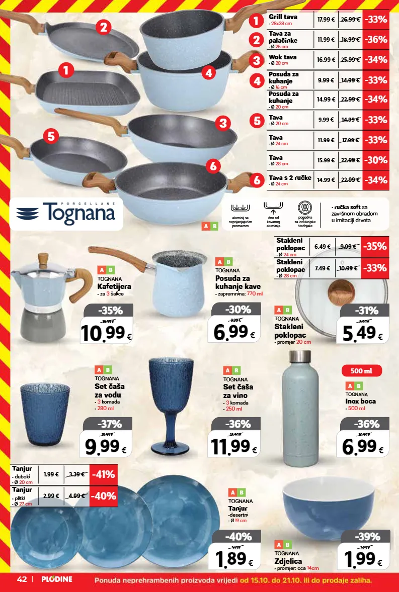 top cijena! već od hit cijena! super prilika! 6 6 . . 99 99 € samo u plodinama -30% -30% 9.99 € top cijena! već od hit cijena! super prilika! 1 1 . . 89 89 € samo u plodinama -40% -40% 3.19 € top cijena! već od hit cijena! super prilika! 6 6 . . 99 99 € samo u plodinama -36% -36% 10.99 € top cijena! već od hit cijena! super prilika! 5 5 . . 49 49 € samo u plodinama -31% -31% 8.99 € tanjur • duboki • ø 20 cm -41% 1.99 € 3.39 € tanjur • plitki • ø 27 cm -40% 2.99 € 4.99 € stakleni poklopac • ø 24 cm -35% 6.49 € 9.99 € stakleni poklopac • ø 28 cm -33% 7.49 € 10.99 € top cijena! već od hit cijena! super prilika! 11 11 . . 99 99 € samo u plodinama -36% -36% 18.99 € top cijena! već od hit cijena! super prilika! 9 9 . . 99 99 € samo u plodinama -37% -37% 15.99 € top cijena! već od hit cijena! super prilika! 1 1 . . 99 99 € samo u plodinama -39% -39% 3.29 € top cijena! već od hit cijena! super prilika! 10 10 . . 99 99 € samo u plodinama -35% -35% 16.99 € a b tognana inox boca • 500 ml a b tognana posuda za kuhanje kave • zapremnina: 770 ml a b tognana stakleni poklopac • promjer 20 cm a b tognana tanjur •desertni • ø 19 cm a b tognana set čaša za vino • 3 komada • 250 ml a b tognana set čaša za vodu • 3 komada • 280 ml a b tognana zdjelica • promjer: cca 14cm a b tognana kafetijera • za 3 šalice 500 ml 2 1 4 5 6 a b c dno od kovanog aluminija aluminij sa neprijanjajućim premazom pogodna za indukcijske štednjake • ručka soft sa završnom obradom u imitaciji drveta tava • ø 20 cm -33% 9.99 € 14.99 € tava • ø 24 cm -33% 11.99 € 17.99 € tava • ø 28 cm -30% 15.99 € 22.99 € tava s 2 ručke • ø 24 cm -34% 14.99 € 22.99 € 3 4 5 6 2 posuda za kuhanje • ø 20 cm -34% 14.99 € 22.99 € posuda za kuhanje • ø 16 cm -33% 9.99 € 14.99 € wok tava • ø 28 cm -34% 16.99 € 25.99 € tava za palačinke • ø 25 cm -36% 11.99 € 18.99 € grill tava • 28x28 cm -33% 17.99 € 26.99 € 1 3 42