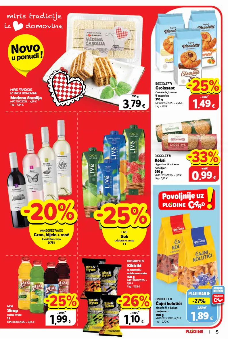 mixi sirup razne vrste 1 l mpc 09.07.2025. = 2,86 € bits&bytes kikiriki u omotaču odabrane vrste 150 g mpc 09.07.2025. = 1,59 € 1 kg = 7,33 € 3 3 . . 79 79 € 350 g biscoletti keksi digestive ili zobene pahuljice 250 g mpc 02.05.2025. = 1,49 € 1 kg = 3,96 € miris tradicije iz srca domovine medena čarolija mpc 10.10.2025. = 4,39 € 1 kg = 11,84 € biscoletti čajni kolutići classic ili s kakao preljevom 700 g mpc 09.07.2025.=2,75 € 1 kg = 2,70 € plati manje 2.59 € -27% -27% 1 1 . . 89 89 € aktiviraj kupon biscoletti croissant čokolada, krema ili marelica 210 g mpc 09.07.2025. = 2,25 € 1 kg = 7,10 € -20% -20% winegreetings crno, bijelo ili rosé kvalitetno vino 0,75 l -25% -25% live sok odabrane vrste 1 l top cijena! već od hit cijena! super prilika! 1 1 . . 49 49 € 250 g samo u plodinama 1.99 € -25% -25% top cijena! već od hit cijena! super prilika! 0 0 . . 99 99 € 250 g samo u plodinama 1.49 € -33% -33% top cijena! već od hit cijena! super prilika! 1 1 . . 10 10 € 125 g samo u plodinama 1.49 € -26% -26% top cijena! već od hit cijena! super prilika! 1 1 . . 99 99 € 125 g samo u plodinama 2.68 € -25% -25% novo u ponudi ! povoljnije uz 5