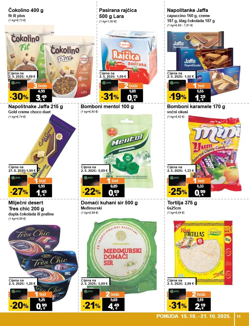 cijena na 2. 5. 2025: 1,25 € cijena na 2. 5. 2025: 5,69 € cijena na 2. 5. 2025: 2,99 € cijena na 2. 5. 2025: 4,99 € cijena na 2. 5. 2025: 1,09 € cijena na 2. 5. 2025: 1,55 € cijena na 27. 8. 2025: 1,99 € cijena na 2. 5. 2025: 0,89 € cijena na 2. 5. 2025: 1,33 € 1,25 0 , 99 - 20 % 1 bod € 5,69 4 , 49 - 21 % 2 boda € 3,19 2 , 19 - 31 % 2 boda € mliječni desert tres chic 200 g dupla čokolada ili praline (1 kg=4,95 €) domaći kuhani sir 500 g međimurski (1 kg=8,98 €) tortilja 375 g 6x25cm (1 kg=5,84 €) 4,99 3 , 49 - 30 % 3 boda € 1,99 1 , 45 - 27 % 1 bod € 0,89 0 , 69 - 22 % 1 bod € 1,33 0 , 99 - 25 % 1 bod € 1,09 0 , 75 - 31 % 2 boda € 1,55 1 , 25 - 19 % 1 bod € čokolino 400 g fit ili plus (1 kg=8,73 €) pasirana rajčica 500 g lara (1 kg=1,50 €) napolitanke jaffa capuccino 160 g, creme 187 g, šlag čokolada 187 g (1 kg=6,68 - 7,81 €) napolitnake jaffa 215 g gold creme choco duet (1 kg=6,74 €) bomboni mentol 100 g (1 kg=6,90 €) bomboni karamele 170 g voćni okusi (1 kg=5,82 €) 11 ponuda 15. 10. - 21. 10. 2025.