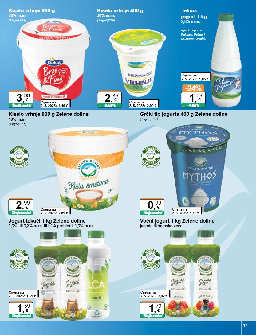 cijena na 2. 5. 2025: 1,35 € cijena na 2. 5. 2025: 2,09 € cijena na 2. 5. 2025: 1,82 € cijena na 2. 5. 2025: 5,34 € cijena na 2. 5. 2025: 0,99 € cijena na 2. 5. 2025: 2,69 € cijena na 2. 5. 2025: 2,49 € cijena na 2. 5. 2025: 2,65 € cijena na 2. 5. 2025: 1,19 € 2,49€ cijena niža od ograničene! svježe mlijeko 1 l 3,2% m.m. birajte mudro! 1 , 19 € alpsko trajno mlijeko 1 l 3,5% m.m. birajte mudro! 1 , 49 € b. aktiv lgg smoothie 330 g jagoda-ananas, borovnica-banana, višnja-ječam, višnja-bučine sj., super matcha, kurkuma ili spirulina (1 kg=4,21 €) birajte mudro! 1 , 49 € trajno mlijeko 6 x 1 l 2,8% m.m. (1 l=0,89 €) birajte mudro! 5 , 34 € mliječni desert 150 g euforija (1 kg=5,00 €) birajte mudro! 0 , 75 € voćni jogurt 1 kg 2,69 € 2 , 19 € mliječni desert 4x100 g monte maxi ili white (1 kg=5,48 €) birajte mudro! 2 , 19 € protein puding 200 g čokolada, vanilija ili karamela (1 kg=4,45 €) birajte mudro! 0 , 89 € 16 mlijeko i mliječni proizvodi ponuda 15. 10. - 21. 10. 2025.