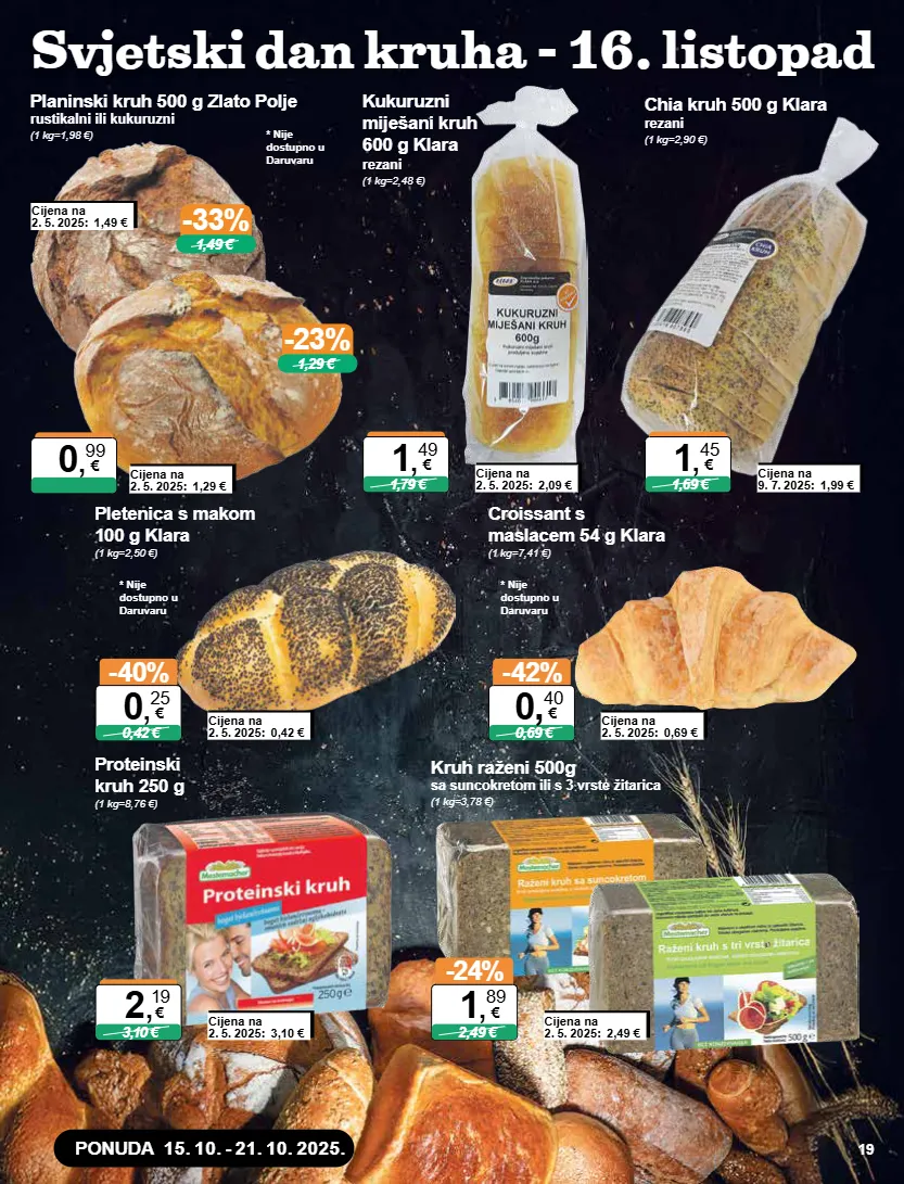 cijena na 2. 5. 2025: 3,10 € cijena na 2. 5. 2025: 2,49 € cijena na 2. 5. 2025: 2,09 € cijena na 9. 7. 2025: 1,99 € cijena na 2. 5. 2025: 1,49 € cijena na 2. 5. 2025: 1,29 € cijena na 2. 5. 2025: 0,42 € cijena na 2. 5. 2025: 0,69 € -33% 1,49 € -23% 1,29 € proteinski kruh 250 g (1 kg=8,76 €) 3,10 € 2 , 19 € kruh raženi 500g sa suncokretom ili s 3 vrste žitarica (1 kg=3,78 €) -24% 2,49 € 1 , 89 € kukuruzni miješani kruh 600 g klara rezani (1 kg=2,48 €) 1,79 € 1 , 49 € chia kruh 500 g klara rezani (1 kg=2,90 €) 1,69 € 1 , 45 € planinski kruh 500 g zlato polje rustikalni ili kukuruzni (1 kg=1,98 €) 0 , 99 € pletenica s makom 100 g klara (1 kg=2,50 €) -40% 0,42 € 0 , 25 € croissant s maslacem 54 g klara (1 kg=7,41 €) -42% 0,69 € 0, 40 € * nije dostupno u daruvaru * nije dostupno u daruvaru * nije dostupno u daruvaru 19 ponuda 15. 10. - 21. 10. 2025. svjetski dan kruha - 16. listopad