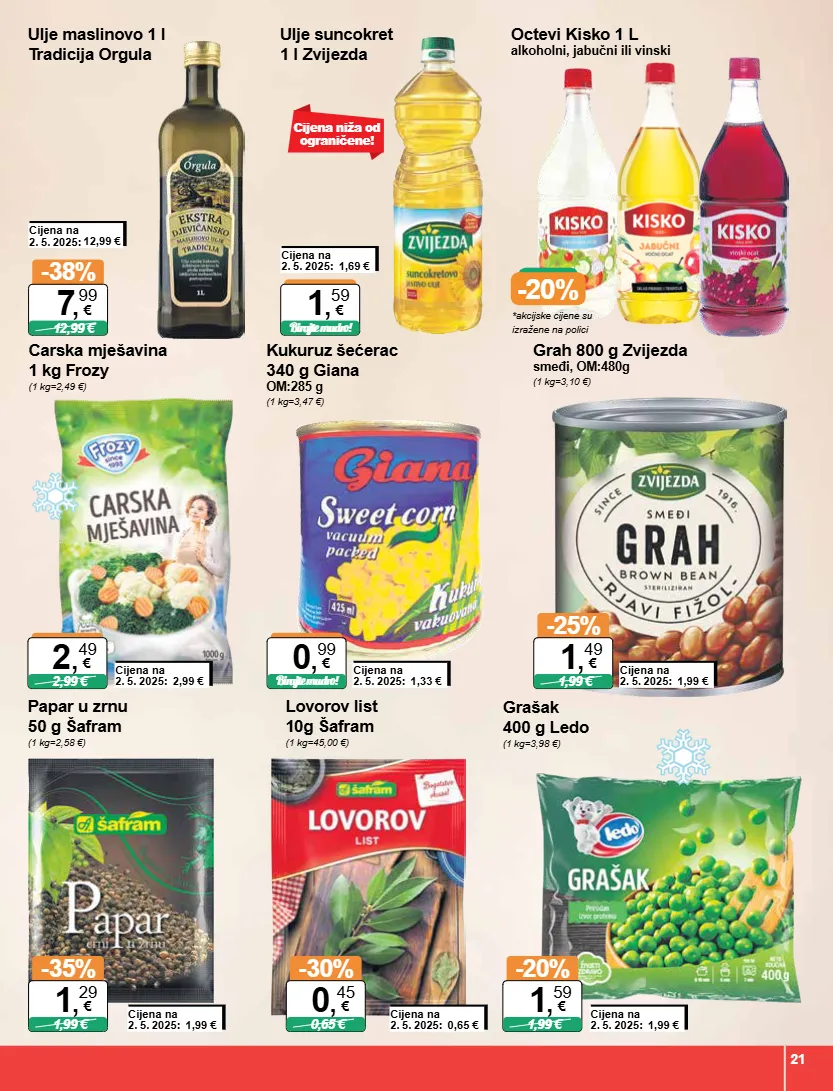 cijena na 2. 5. 2025: 1,69 € cijena na 2. 5. 2025: 12,99 € cijena na 2. 5. 2025: 2,99 € *akcijske cijene su izražene na polici -20% cijena na 2. 5. 2025: 1,99 € cijena na 2. 5. 2025: 1,33 € cijena na 2. 5. 2025: 1,99 € cijena na 2. 5. 2025: 1,99 € cijena na 2. 5. 2025: 0,65 € cijena niža od ograničene! ulje suncokret 1 l zvijezda birajte mudro! 1 , 59 € ulje maslinovo 1 l tradicija orgula -38% 12,99 € 7 , 99 € carska mješavina 1 kg frozy (1 kg=2,49 €) 2,99 € 2 , 49 € grašak 400 g ledo (1 kg=3,98 €) -20% 1,99 € 1 , 59 € octevi kisko 1 l alkoholni, jabučni ili vinski kukuruz šećerac 340 g giana om:285 g (1 kg=3,47 €) birajte mudro! 0 , 99 € grah 800 g zvijezda smeđi, om:480g (1 kg=3,10 €) -25% 1,99 € 1 , 49 € papar u zrnu 50 g šafram (1 kg=2,58 €) -35% 1,99 € 1 , 29 € lovorov list 10g šafram (1 kg=45,00 €) -30% 0,65 € 0 , 45 € 21