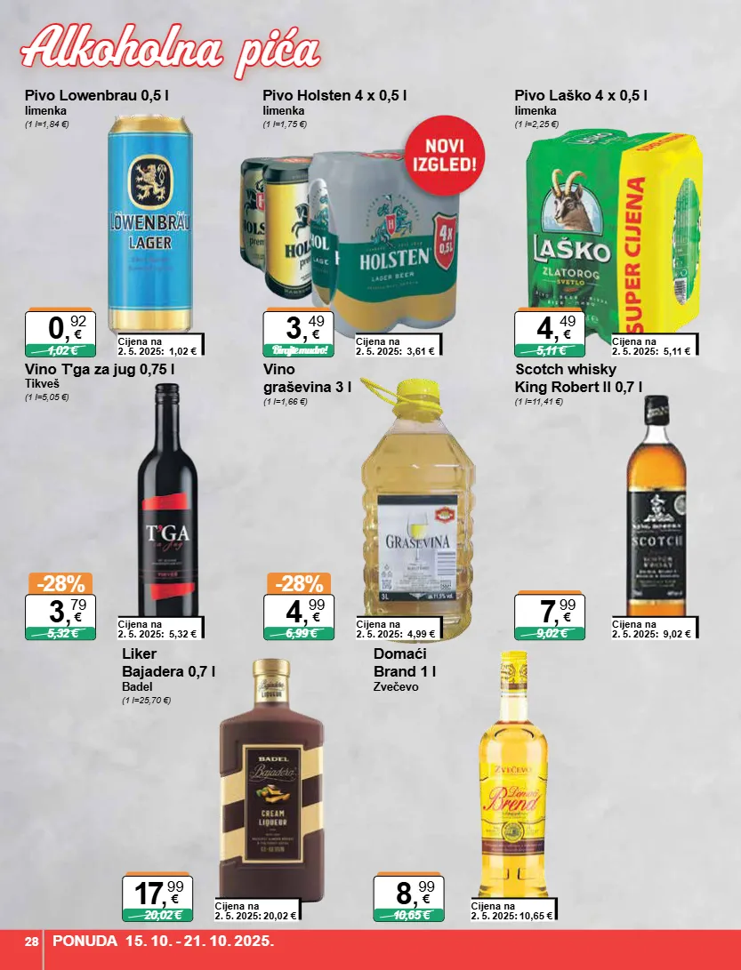 cijena na 2. 5. 2025: 1,02 € cijena na 2. 5. 2025: 3,61 € cijena na 2. 5. 2025: 5,11 € cijena na 2. 5. 2025: 5,32 € cijena na 2. 5. 2025: 4,99 € cijena na 2. 5. 2025: 20,02 € cijena na 2. 5. 2025: 9,02 € cijena na 2. 5. 2025: 10,65 € pivo lowenbrau 0,5 l limenka (1 l=1,84 €) 1,02 € 0 , 92 € pivo holsten 4 x 0,5 l limenka (1 l=1,75 €) birajte mudro! 3 , 49 € pivo laško 4 x 0,5 l limenka (1 l=2,25 €) 5,11 € 4 , 49 € vino t'ga za jug 0,75 l tikveš (1 l=5,05 €) -28% 5,32 € 3 , 79 € vino graševina 3 l (1 l=1,66 €) -28% 6,99 € 4 , 99 € liker bajadera 0,7 l badel (1 l=25,70 €) 20,02 € 17 , 99 € 10,65 € 8 , 99 € scotch whisky king robert ii 0,7 l (1 l=11,41 €) 9,02 € 7 , 99 € domaći brand 1 l zvečevo ponuda 15. 10. - 21. 10. 2025. 28 alkoholna pića alkoholna pića
