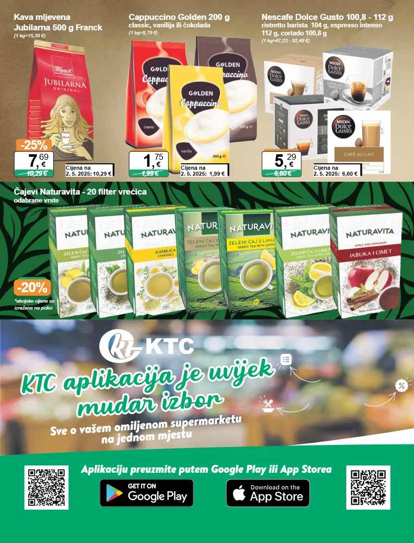 *akcijske cijene su izražene na polici -20% cijena na 2. 5. 2025: 10,29 € cijena na 2. 5. 2025: 1,99 € cijena na 2. 5. 2025: 6,60 € čajevi naturavita - 20 filter vrećica odabrane vrste kava mljevena jubilarna 500 g franck (1 kg=15,38 €) -25% 10,29 € 7 , 69 € cappuccino golden 200 g classic, vanilija ili čokolada (1 kg=8,75 €) 1,99 € 1 , 75 € nescafe dolce gusto 100,8 - 112 g ristretto barista 104 g, espresso intenso 112 g, cortado 100,8 g (1 kg=47,23 - 52,48 €) 6,60 € 5 , 29 € 29 k tc aplikacija je uvijek k tc aplikacija je uvijek mudar izbor mudar izbor sve o vašem omiljenom supermarketu na jednom mjestu aplikaciju preuzmite putem google play ili app storea