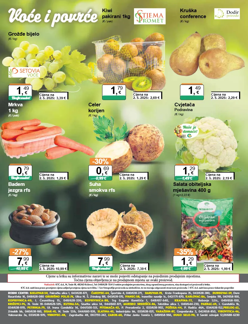 nakladnik: ktc d.d., n, tesle 18, 48260 križevci, tel: 048/628-554 u nekim prodajnim prostorima, zbog ograničenog prostora, nisu dostupni svi proizvodi iz letka . ktc d.d. zadržava pravo promjene cijena uslijed promjena cijena na tržištu | sve fotografije proizvoda su simbolične, te ne moraju odgovarati stvarnom proizvodu | ktc d.d. zadržava pravo tiskarske pogreške robni centri: bjelovar-50 , pakračka ulica 1, 043/638-871, čakovec-64 , športska 4, 040/638-271, daruvar-78 , krste frankopana 35, 043/638-380, đurđevac-59 , đure basaričeka 16, 048/628-080 grubišno polje-76 , ulica n. š. zrinskog bb, 043/639-170, ivanec-58, ivanečko naselje 1c, 042/771-870, karlovac-8a, senjska 118, 047/658-100, koprivnica-40, i. česmičkog 15, 048/628-330, koprivnica-88, trg eugena kumičića 1, 048/617-640, krapina-77, bobovje 52/c, 049/658-100, križevci-95, n. tesle 18–048/628-595, kutina-54, sisačka ulica 14, 044/660-871, mursko središće-86, tekstilna ulica 1, 040/644-230, pakrac-69, i. gundulića 1b, 034/638-970, petrinja-79, ul. ivana gundulića 14, 044/500-551, pitomača-42, p. preradovića 2, 033/638-902, požega-44, p. radića 46a, 034/638-152, prelog-62, zrinskih bb, 040/638-160, sisak-41, n. tesle 12/b, 044/660-926, slatina-43, industrijska bb, 033/638-021, varaždin-87, gospodarska 3, 042/658-850, virovitica-46, vukovarska 3a, 033/638-970, vrbovec-48, zagrebačka 48, 01/2793-242, zabok-60, prilaz janka tomića 1, 049/658-966, dugo selo-90, ii savski odvojak 12,01/688-6230 cijene u letku su informativne naravi te se može pojaviti odstupanje na pojedinim prodajnim mjestima. točna cijena objavljena je na prodajnom mjestu uz svaki proizvod. cijena na 2. 5. 2025: 1,29 € cijena na 2. 5. 2025: 2,19 € cijena na 2. 5. 2025: 3,39 € cijena na 2. 5. 2025: 2,69 € cijena na 2. 5. 2025: 2,29 € cijena na 2. 5. 2025: 1,99 € cijena na 2. 5. 2025: 1,29 € cijena na 2. 5. 2025: 10,99 € cijena na 2. 5. 2025: 7,39 € naše je domaće! celer korijen (€ / kg) -30% 0,99 € 0 , 69 € cvjetača podravina (€ / kg) 1,49 € 1 , 29 € grožđe bijelo (€ / kg) birajte mudro! 1 , 49 € kiwi pakirani 1kg (€ / pak) 1 , 79 € kruška conference (€ / kg) 1 , 49 € salata obiteljska mješavina 400 g (1 kg=3,23 €) -35% 1,99 € 1 , 29 € mrkva 1 kg (€ / pak) birajte mudro! 0 , 79 € badem jezgra rfs (€ / kg) -27% 10,99 € 7 , 99 € suha smokva rfs (€ / kg) birajte mudro! 7 , 99 € voće i povrće
