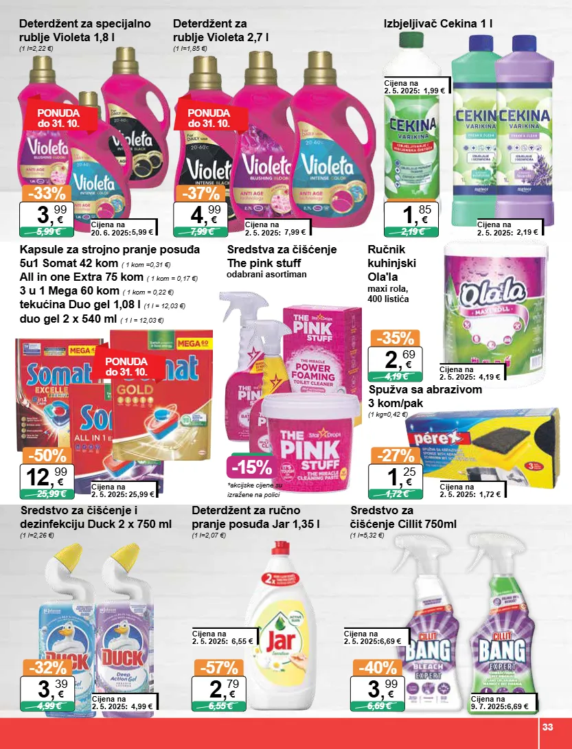 cijena na 2. 5. 2025: 4,19 € cijena na 20. 6. 2025:5,99 € cijena na 2. 5. 2025: 7,99 € cijena na 2. 5. 2025: 1,99 € cijena na 2. 5. 2025: 2,19 € cijena na 2. 5. 2025: 4,99 € cijena na 2. 5. 2025: 6,55 € cijena na 2. 5. 2025: 25,99 € cijena na 2. 5. 2025:6,69 € cijena na 9. 7. 2025:6,69 € *akcijske cijene su izražene na polici -15% cijena na 2. 5. 2025: 1,72 € ručnik kuhinjski ola'la maxi rola, 400 listića -35% 4,19 € 2 , 69 € ponuda do 31. 10. ponuda do 31. 10. deterdžent za specijalno rublje violeta 1,8 l (1 l=2,22 €) -33% 5,99 € 3 , 99 € deterdžent za rublje violeta 2,7 l (1 l=1,85 €) -37% 7,99 € 4 , 99 € izbjeljivač cekina 1 l 2,19 € 1 , 85 € sredstvo za čišćenje i dezinfekciju duck 2 x 750 ml (1 l=2,26 €) -32% 4,99 € 3 , 39 € ponuda do 31. 10. deterdžent za ručno pranje posuđa jar 1,35 l (1 l=2,07 €) -57% 6,55 € 2 , 79 € kapsule za strojno pranje posuđa 5u1 somat 42 kom ( 1 kom =0,31 €) all in one extra 75 kom ( 1 kom = 0,17 €) 3 u 1 mega 60 kom ( 1 kom = 0,22 €) tekućina duo gel 1,08 l (1 l = 12,03 €) duo gel 2 x 540 ml ( 1 l = 12,03 €) -50% 25,99 € 12 , 99 € sredstvo za čišćenje cillit 750ml (1 l=5,32 €) -40% 6,69 € 3 , 99 € sredstva za čišćenje the pink stuff odabrani asortiman spužva sa abrazivom 3 kom/pak (1 kg=0,42 €) -27% 1,72 € 1 , 25 € 33