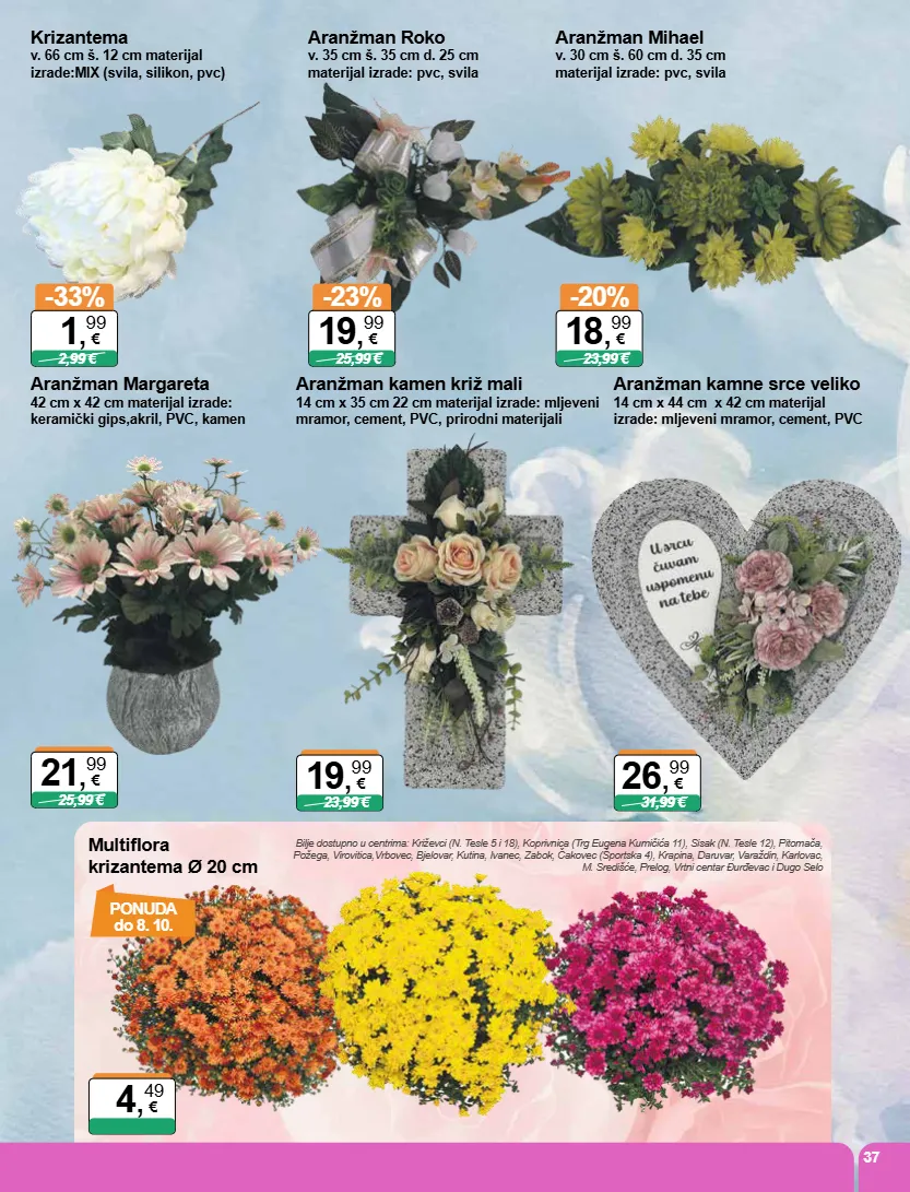 Bilje dostupno u centrima: Križevci (N. Tesle 5 i 18), Koprivnica (Trg Eugena Kumičića 11), Sisak (N. Tesle 12), Pitomača, Požega, Virovitica,Vrbovec, Bjelovar, Kutina, Ivanec, Zabok, Čakovec (Športska 4), Krapina, Daruvar, Varaždin, Karlovac, M. Središće, Prelog, Vrtni centar Đurđevac i Dugo Selo PONUDA do 8. 10. Krizantema v. 66 cm š. 12 cm materijal izrade:MIX (svila, silikon, pvc) -33% 2,99 € 1 , 99 € Aranžman Roko v. 35 cm š. 35 cm d. 25 cm materijal izrade: pvc, svila -23% 25,99 € 19 , 99 € Aranžman Mihael v. 30 cm š. 60 cm d. 35 cm materijal izrade: pvc, svila -20% 23,99 € 18 , 99 € Aranžman Margareta 42 cm x 42 cm materijal izrade: keramički gips,akril, PVC, kamen 25,99 € 21 , 99 € Aranžman kamen križ mali 14 cm x 35 cm 22 cm materijal izrade: mljeveni mramor, cement, PVC, prirodni materijali 23,99 € 19 , 99 € Aranžman kamne srce veliko 14 cm x 44 cm x 42 cm materijal izrade: mljeveni mramor, cement, PVC 31,99 € 26 , 99 € Multiflora krizantema Ø 20 cm 4 , 49 € 37