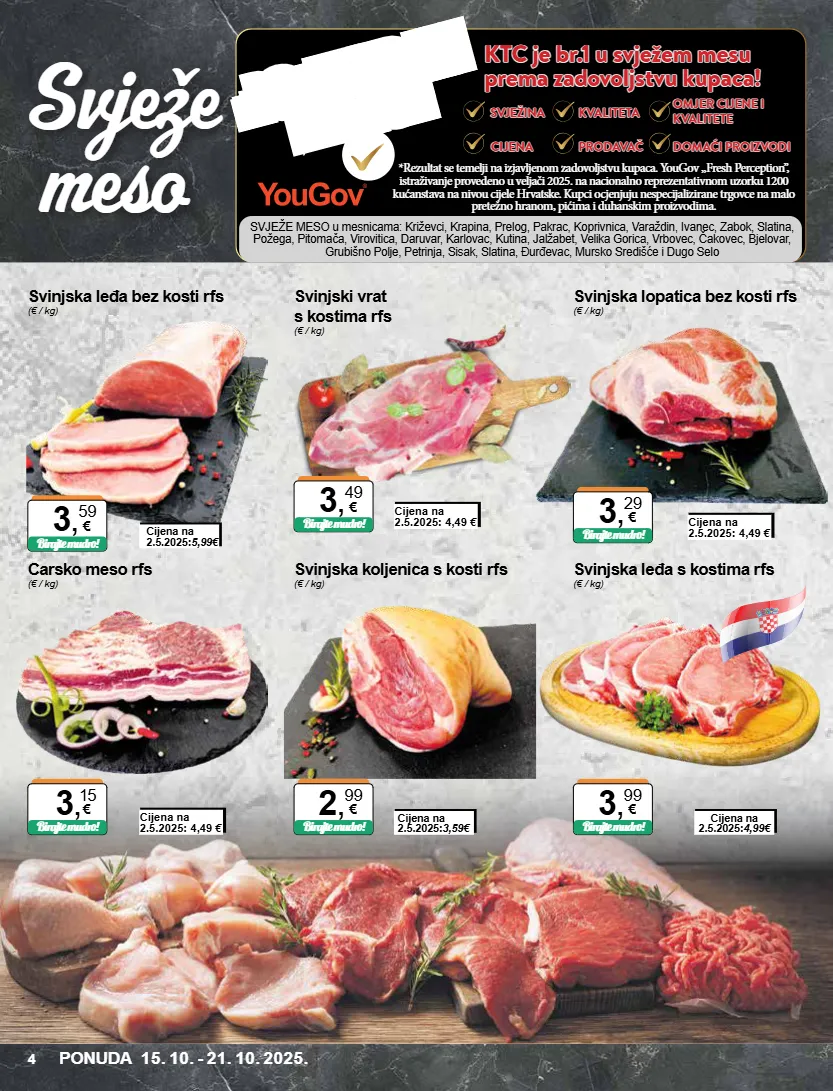 svježe meso u mesnicama: križevci, krapina, prelog, pakrac, koprivnica, varaždin, ivanec, zabok, slatina, požega, pitomača, virovitica, daruvar, karlovac, kutina, jalžabet, velika gorica, vrbovec, čakovec, bjelovar, grubišno polje, petrinja, sisak, slatina, đurđevac, mursko središće i dugo selo ktc je br.1 u svježem mesu ktc je br.1 u svježem mesu prema zadovoljstvu kupaca! prema zadovoljstvu kupaca! *rezultat se temelji na izjavljenom zadovoljstvu kupaca. yougov „fresh perception”, istraživanje provedeno u veljači 2025. na nacionalno reprezentativnom uzorku 1200 kućanstava na nivou cijele hrvatske. kupci ocjenjuju nespecijalizirane trgovce na malo pretežno hranom, pićima i duhanskim proizvodima. domaći proizvodi domaći proizvodi omjer cijene i omjer cijene i kvalitete kvalitete prodavač prodavač kvaliteta kvaliteta svježina svježina cijena cijena potvrdili kupci cijena na 2.5.2025: 3,59€ cijena na 2.5.2025: 5,99€ cijena na 2.5.2025: 4,99€ cijena na 2.5.2025: 4,49 € cijena na 2.5.2025: 4,49 € cijena na 2.5.2025: 4,49 € svinjska lopatica bez kosti rfs (€ / kg) carsko meso rfs (€ / kg) svinjski vrat s kostima rfs (€ / kg) svinjska koljenica s kosti rfs (€ / kg) svinjska leđa bez kosti rfs (€ / kg) svinjska leđa s kostima rfs (€ / kg) birajte mudro! 3 , 29 € birajte mudro! 3 , 49 € birajte mudro! 3 , 15 € birajte mudro! 2 , 99 € birajte mudro! 3 , 59 € birajte mudro! 3 , 99 € ponuda 15. 10. - 21. 10. 2025. 4 svježe meso