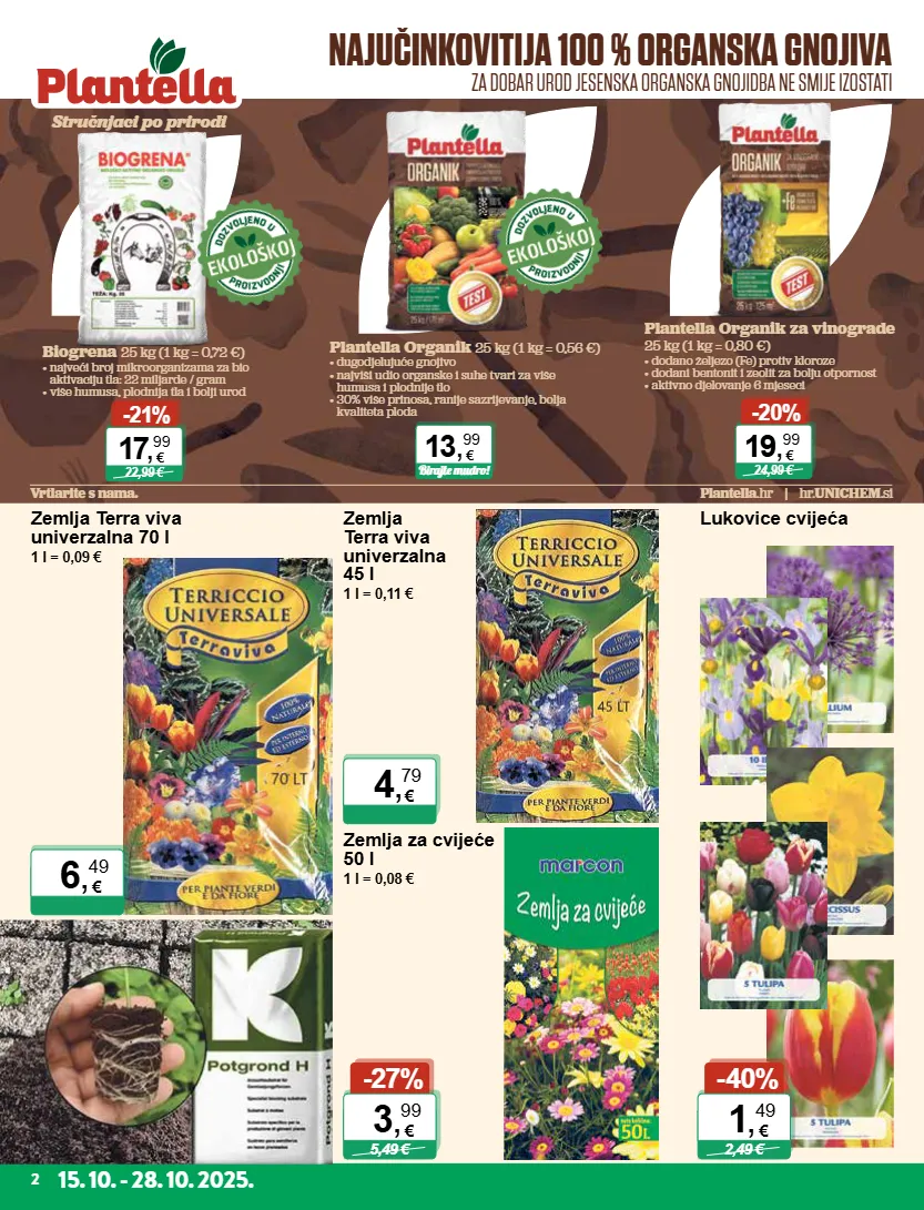15. 10. - 28. 10. 2025. 2 6 , 49 € 4 , 79 € -40% 2,49 € 1 , 49 € - 27 % 5,49 € 3 , 99 € birajte mudro! 13 , 99 € -21% 22,99 € 17 , 99 € -20% 24,99 € 19 , 99 € zemlja terra viva univerzalna 70 l 1 l = 0,09 € zemlja terra viva univerzalna 45 l 1 l = 0,11 € lukovice cvijeća zemlja za cvijeće 50 l 1 l = 0,08 € vrtlarite s nama. plantella .hr | hr. unichem .si stručnjaci po prirodi najučinkovitija 100 % organska gnojiva za dobar urod jesenska organska gnojidba ne smije izostati plantella organik 25 kg (1 kg = 0,56 €) biogrena 25 kg (1 kg = 0,72 €) • najveći broj mikroorganizama za bio aktivaciju tla: 22 miljarde / gram • više humusa, plodnija tla i bolji urod • dugodjelujuće gnojivo • najviši udio organske i suhe tvari za više humusa i plodnije tlo • 30% više prinosa, ranije sazrijevanje, bolja kvaliteta ploda plantella organik za vinograde 25 kg (1 kg = 0,80 €) • dodano željezo (fe) protiv kloroze • dodani bentonit i zeolit za bolju otpornost • aktivno djelovanje 6 mjeseci