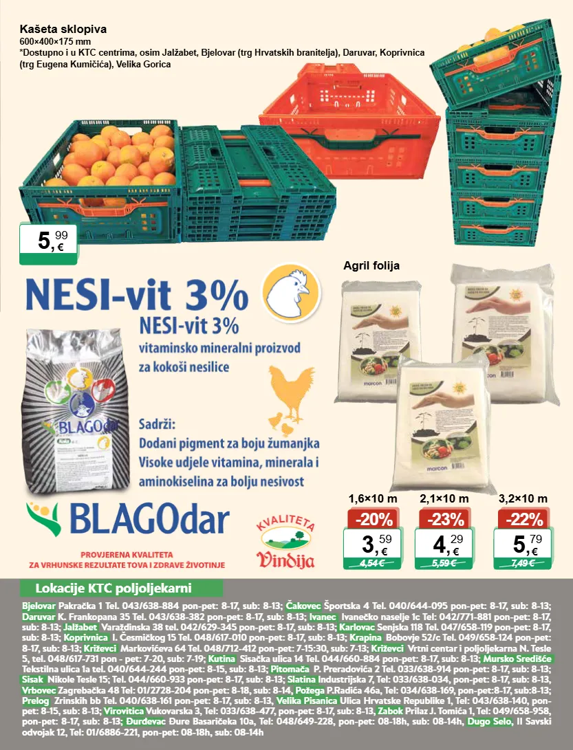 Birajte mudro! 3 5 , 99 € -20% 4,54 € 3 , 59 € 1,6×10 m - 23 % 5,59 € 4 , 29 € 2,1×10 m - 22 % 7,49 € 5 , 79 € 3,2×10 m Agril folija Kašeta sklopiva 600×400×175 mm *Dostupno i u KTC centrima, osim Jalžabet, Bjelovar (trg Hrvatskih branitelja), Daruvar, Koprivnica (trg Eugena Kumičića), Velika Gorica Lokacije KTC poljoljekarni Bjelovar Pakračka 1 Tel. 043/638-884 pon-pet: 8-17, sub: 8-13; Čakovec Športska 4 Tel. 040/644-095 pon-pet: 8-17, sub: 8-13; Daruvar K. Frankopana 35 Tel. 043/638-382 pon-pet: 8-17, sub: 8-13; Ivanec Ivanečko naselje 1c Tel: 042/771-881 pon-pet: 8-17, sub: 8-13; Jalžabet Varaždinska 38 tel. 042/629-345 pon-pet: 8-17, sub: 8-13; Karlovac Senjska 118 Tel. 047/658-119 pon-pet: 8-17, sub: 8-13; Koprivnica I. Česmičkog 15 Tel. 048/617-010 pon-pet: 8-17, sub: 8-13; Krapina Bobovje 52/c Tel. 049/658-124 pon-pet: 8-17, sub: 8-13; Križevci Markovićeva 64 Tel. 048/712-412 pon-pet: 7-15:30, sub: 7-13; Križevci Vrtni centar i poljoljekarna N. Tesle 5, tel. 048/617-731 pon - pet: 7-20, sub: 7-19; Kutina Sisačka ulica 14 Tel. 044/660-884 pon-pet: 8-17, sub: 8-13; Mursko Središće Tekstilna ulica 1a tel. 040/644-244 pon-pet: 8-15, sub: 8-13; Pitomača P. Preradovića 2 Tel. 033/638-914 pon-pet: 8-17, sub: 8-13; Sisak Nikole Tesle 15; Tel. 044/660-933 pon-pet: 8-17, sub: 8-13; Slatina Industrijska 7, Tel: 033/638-034, pon-pet: 8-17, sub: 8-13, Vrbovec Zagrebačka 48 Tel: 01/2728-204 pon-pet: 8-18, sub: 8-14, Požega P.Radića 46a, Tel: 034/638-169, pon-pet:8-17, sub:8-13; Prelog Zrinskih bb Tel. 040/638-161 pon-pet: 8-17, sub: 8-13, Velika Pisanica Ulica Hrvatske Republike 1, Tel: 043/638-140, pon- pet: 8-15, sub: 8-13; Virovitica Vukovarska 3, Tel: 033/638-477, pon-pet: 8-17, sub: 8-13, Zabok Prilaz J. Tomića 1, Tel: 049/658-958, pon-pet: 8-17, sub: 8-13; Đurđevac Đure Basaričeka 10a, Tel: 048/649-228, pon-pet: 08-18h, sub: 08-14h, Dugo Selo, II Savski odvojak 12, Tel: 01/6886-221, pon-pet: 08-18h, sub: 08-14h