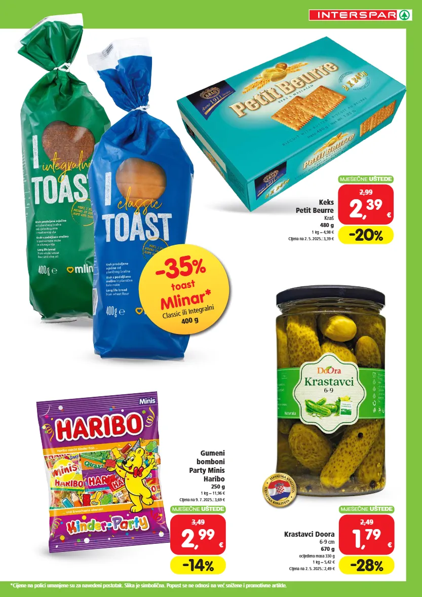 -35 % toast mlinar* classic ili integralni 400 g h r v a t s k a k v a l i t e t a h r v a t s k a k v a l i t e t a *cijene na polici umanjene su za navedeni postotak. slika je simbolična. popust se ne odnosi na već snižene i promotivne artikle. -14 % mjesečne uštede 3,49 2 , 99 € gumeni bomboni party minis haribo 250 g 1 kg = 11,96 € cijena na 9. 7. 2025.: 3,69 € -20 % mjesečne uštede 2,99 2 , 39 € keks petit beurre kraš 480 g 1 kg = 4,98 € cijena na 2. 5. 2025.: 3,39 € -28 % mjesečne uštede 2,49 1 , 79 € krastavci doora 6-9 cm 670 g ocijeđena masa 330 g 1 kg = 5,42 € cijena na 2. 5. 2025.: 2,49 €