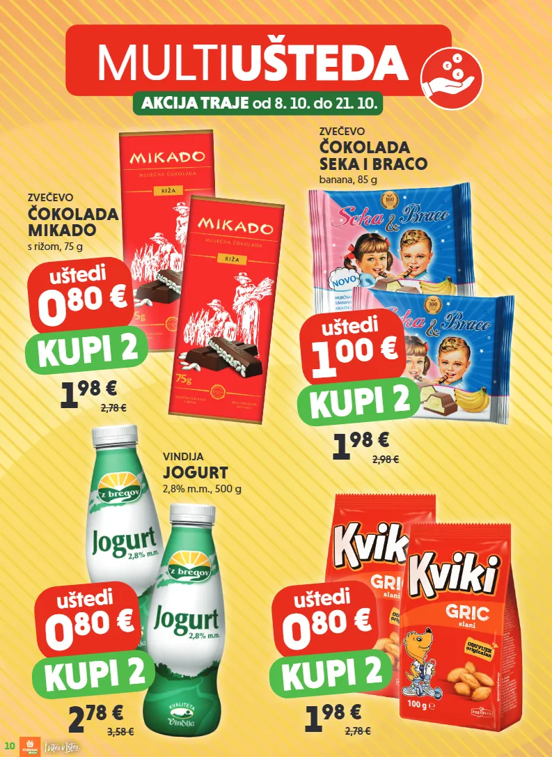 10 2,78 € 1 98 € uštedi 0 80 € kupi 2 vindija jogurt 2,8% m.m., 500 g 3,58 € 2 78 € uštedi 0 80 € kupi 2 2,78 € 1 98 € uštedi 0 80 € kupi 2 zvečevo čokolada seka i braco banana, 85 g 2,98 € 1 98 € uštedi 1 00 € kupi 2 multi ušteda akcija traje od 8. 10. do 21. 10. € € € zvečevo čokolada mikado s rižom, 75 g
