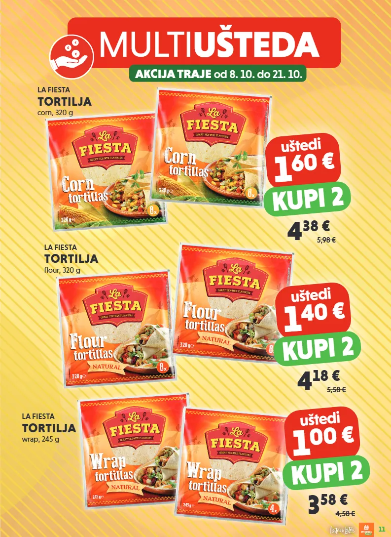 11 LA FIESTA TORTILJA corn, 320 g 5,98 € 4 38 € uštedi 1 60 € KUPI 2 LA FIESTA TORTILJA flour, 320 g 5,58 € 4 18 € uštedi 1 40 € KUPI 2 LA FIESTA TORTILJA wrap, 245 g 4,58 € 3 58 € uštedi 1 00 € KUPI 2 MULTI UŠTEDA AKCIJA TRAJE od 8. 10. do 21. 10. € € €