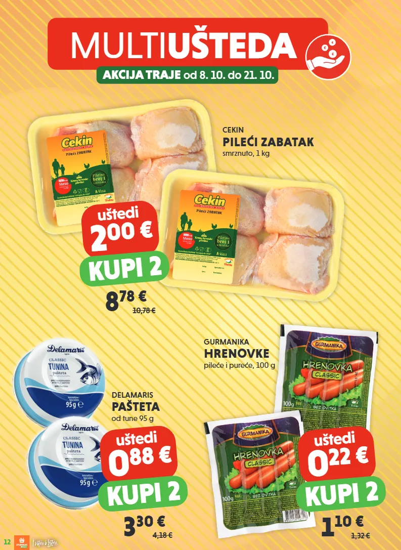 12 gurmanika hrenovke pileće i pureće, 100 g 1,32 € 1 10 € uštedi 0 22 € kupi 2 delamaris pašteta od tune 95 g cekin pileći zabatak smrznuto, 1 kg 10,78 € 8 78 € uštedi 2 00 € kupi 2 multi ušteda akcija traje od 8. 10. do 21. 10. € € € 4,18 € 3 30 € uštedi 0 88 € kupi 2