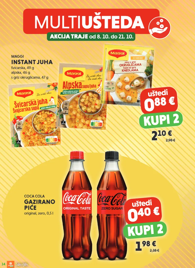 14 coca cola gazirano piće original, zero, 0,5 l multi ušteda akcija traje od 8. 10. do 21. 10. € € € 2,38 € 1 98 € uštedi 0 40 € kupi 2 maggi instant juha švicarska, 49 g alpska, 46 g s griz okruglicama, 47 g 2,98 € 2 10 € uštedi 0 88 € kupi 2