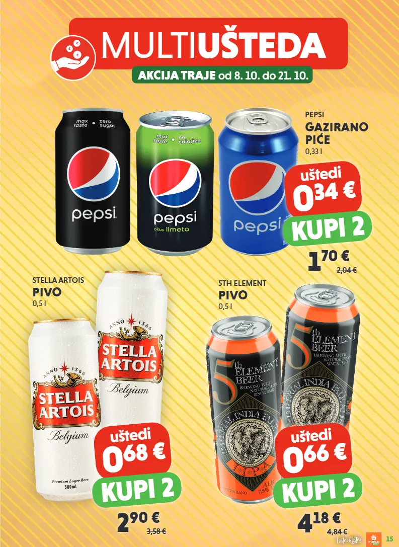 15 stella artois pivo 0,5 l multi ušteda akcija traje od 8. 10. do 21. 10. € € € 5th element pivo 0,5 l 2,04 € 1 70 € uštedi 0 34 € kupi 2 pepsi gazirano piće 0,33 l 3,58 € 2 90 € uštedi 0 68 € kupi 2 4,84 € 4 18 € uštedi 0 66 € kupi 2